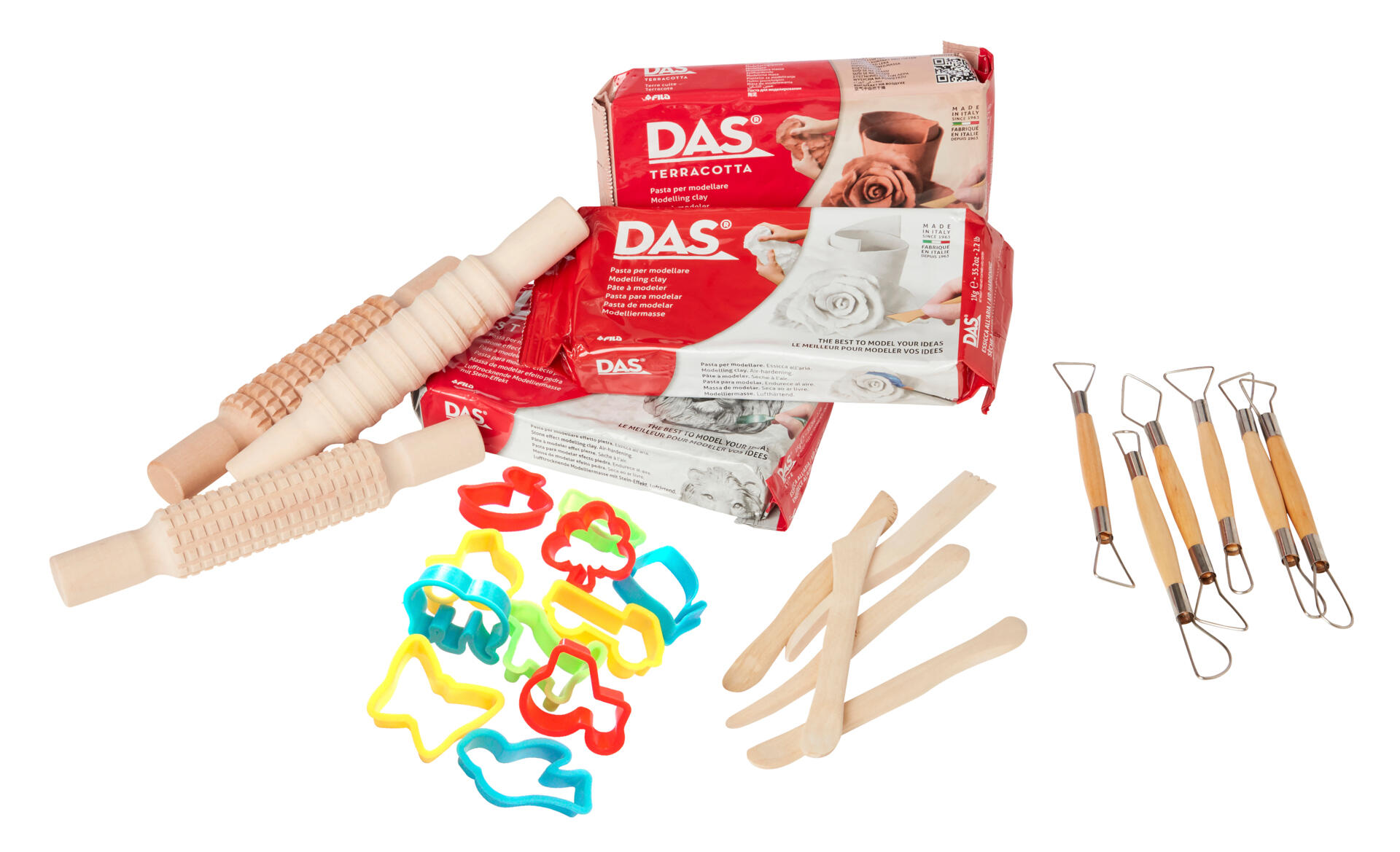 Käytännöllinen laatikko, joka on täynnä luovaa materiaalia. Helppo ottaa mukaan tai siirtää paikasta toiseen. Sisältö: 1 kg DAS terrakotta, 1 kg DAS valkoinen, 1 kg DAS stone, 5 metallista eläinmuottia, 5 puista muovailupuikkoa, 3 kuvioitua puukaulinta, 6 silmukkarautaa 20 cm ja kannellinen säilytyslaatikko. Mitat: 40 x 30 x 19 cm.