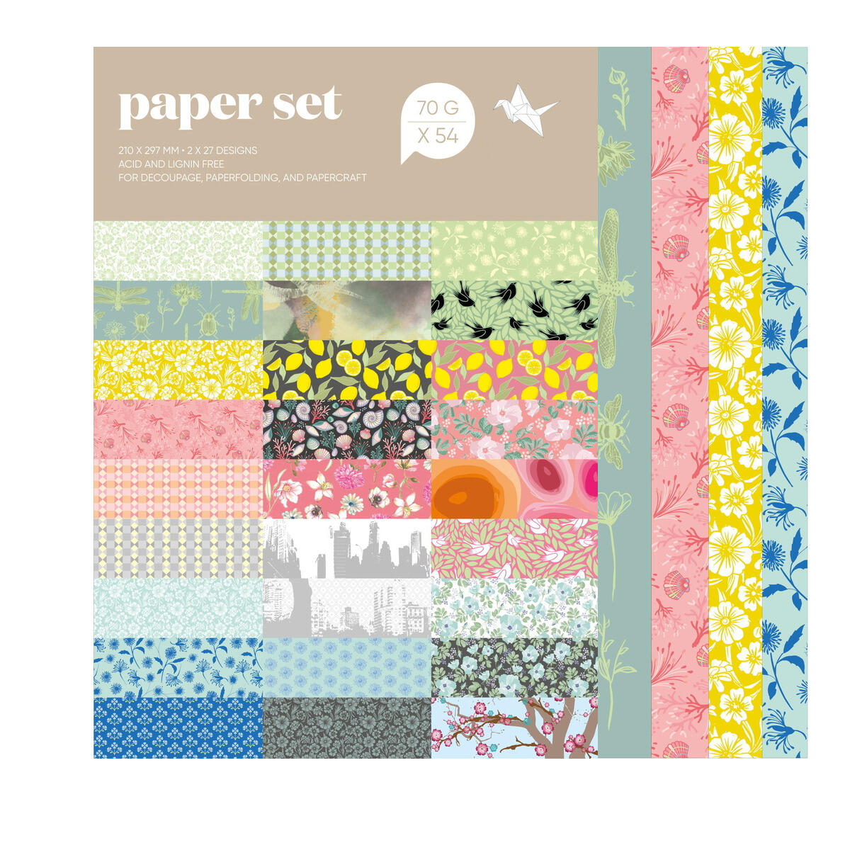 Valikoima erilaisia kuvioita, joissa on kukkia ja koristeellisia kuvioita pehmeissä ja iloisissa väreissä. Paperit ovat yksipuolisia, joten ne sopivat erinomaisesti omien korttien luomiseen, origamin taitteluun, lahjapakkausten koristeluun tai scrapbooking-projekteihin. 27 erilaista kuviota, 2 arkkia kutakin. Hapoton ja ligniinivapaa. Mitat: 210 × 297 mm.