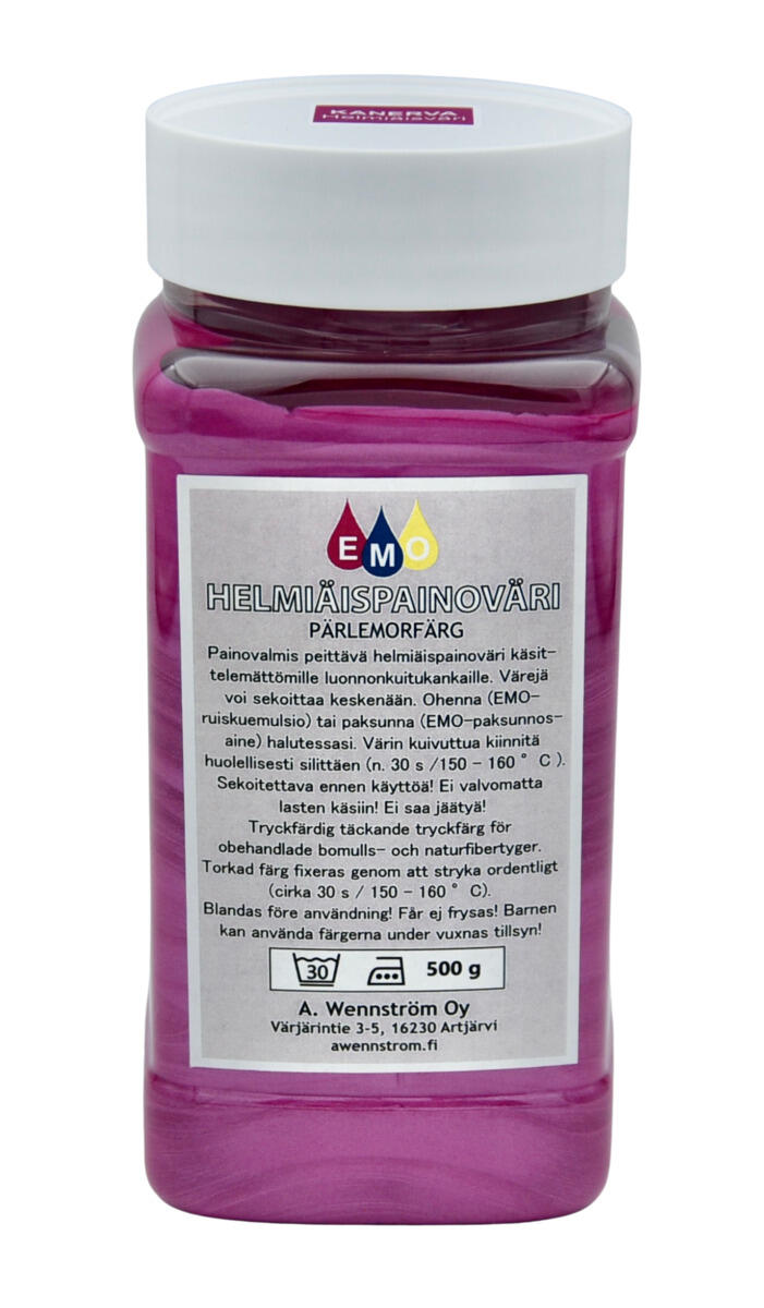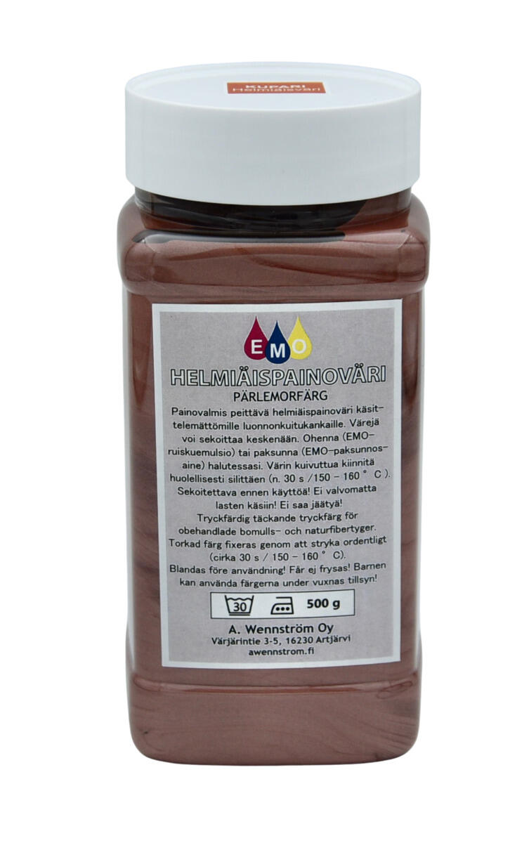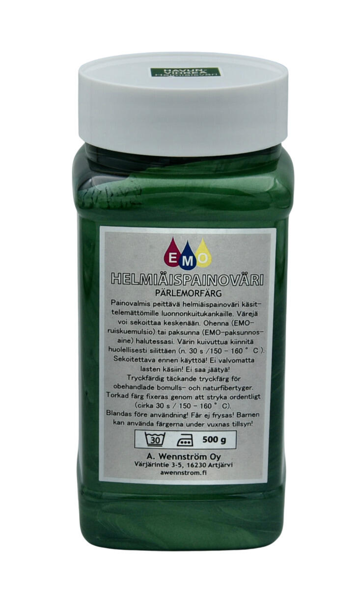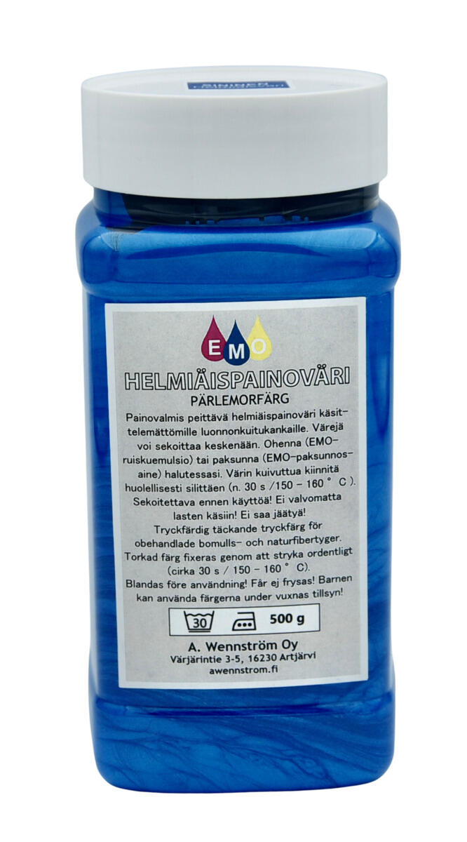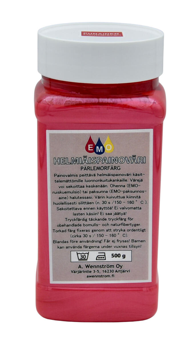 Helmiäisväri on peittävä ja soveltuu käytettäväksi kaikille vaaleille ja värillisille luonnonkuitukankaille. Värejä voidaan sekoittaa keskenään ja ohentaa EMO ruiskuemulsiolla. Huomioitavaa: Peittovärit vaativat useamman kerroksen väriä ollakseen kunnolla peittäviä riippuen värin ja painettavan pohjan kontrastista. Keskimäärin kolme kerrosta on riittävä tilanteessa kuin tilanteessa. Lämpökäsittely: Lämpökäsittele painotyö huolellisesti sen kuivuttua.
