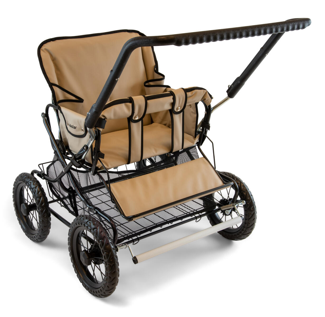Perinteiset kaksostenrattaat, verhoiltu helposti pyyhittävällä polyuretaanilla. Varustettu puhkeamattomilla umpipyörillä ja nelipyöräjousituksella, jotka parantavat mukavuutta. Pyörät on helppo irrottaa kuljetusta ja puhdistusta varten. Rattaita on kevyt työntää, koska jokaisessa pyörässä on kuulalaakerit. Istuimen turvakaaren voi kaataa ja lapset on helpompi nostaa rattaisiin ja rattaista pois. Selkätuen voi kääntää makuuasentoon. Työntöaisan korkeus on säädettävissä viiteen eri asentoon 94-103 cm. Mukana lastenvaljaat. Päällinen on polyuretaania, Öko-tex-sertifioitu, luokka 1. Rattaiden painoraja on 2 x 22 kg, tavarakorin 10 kg.