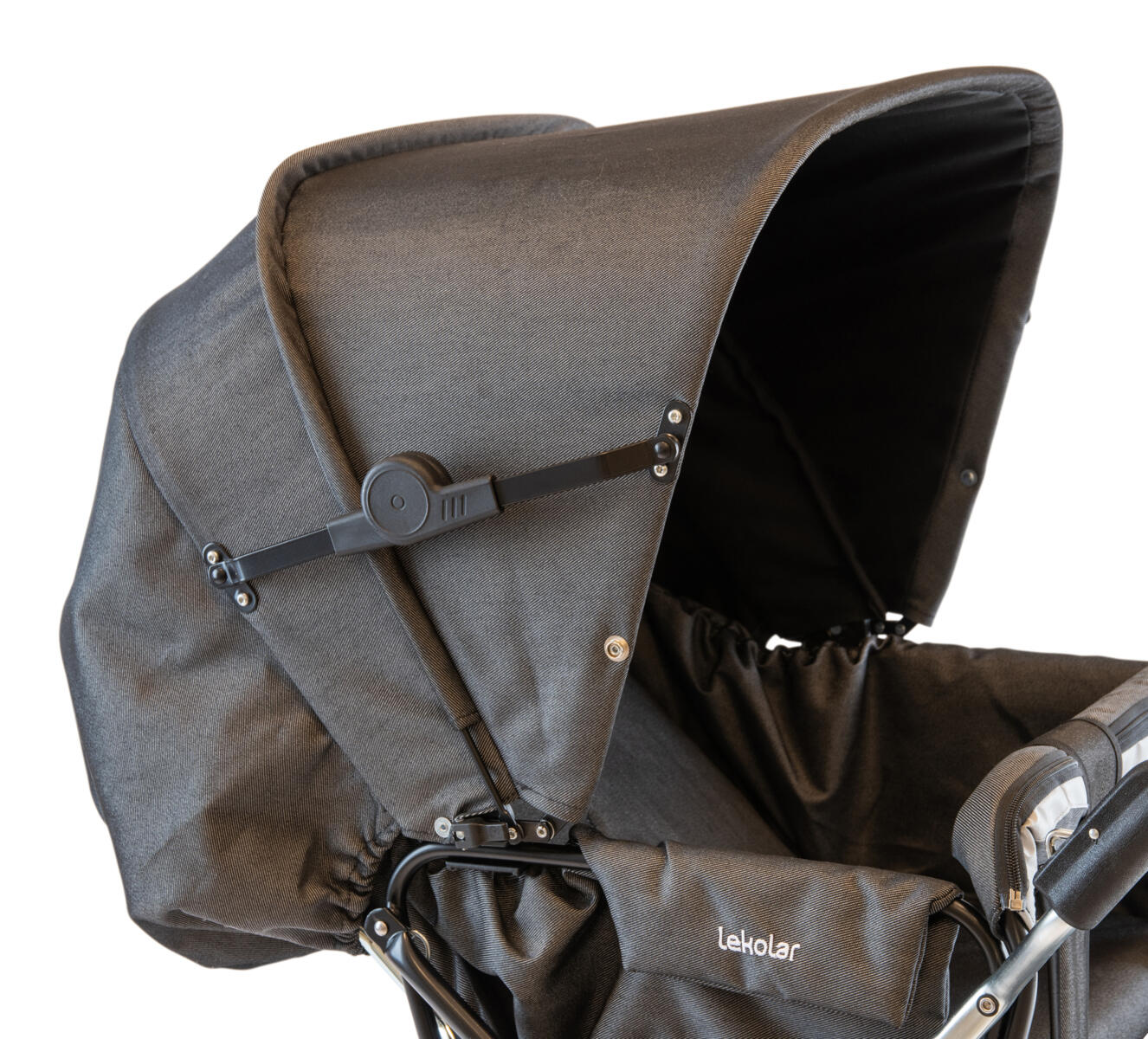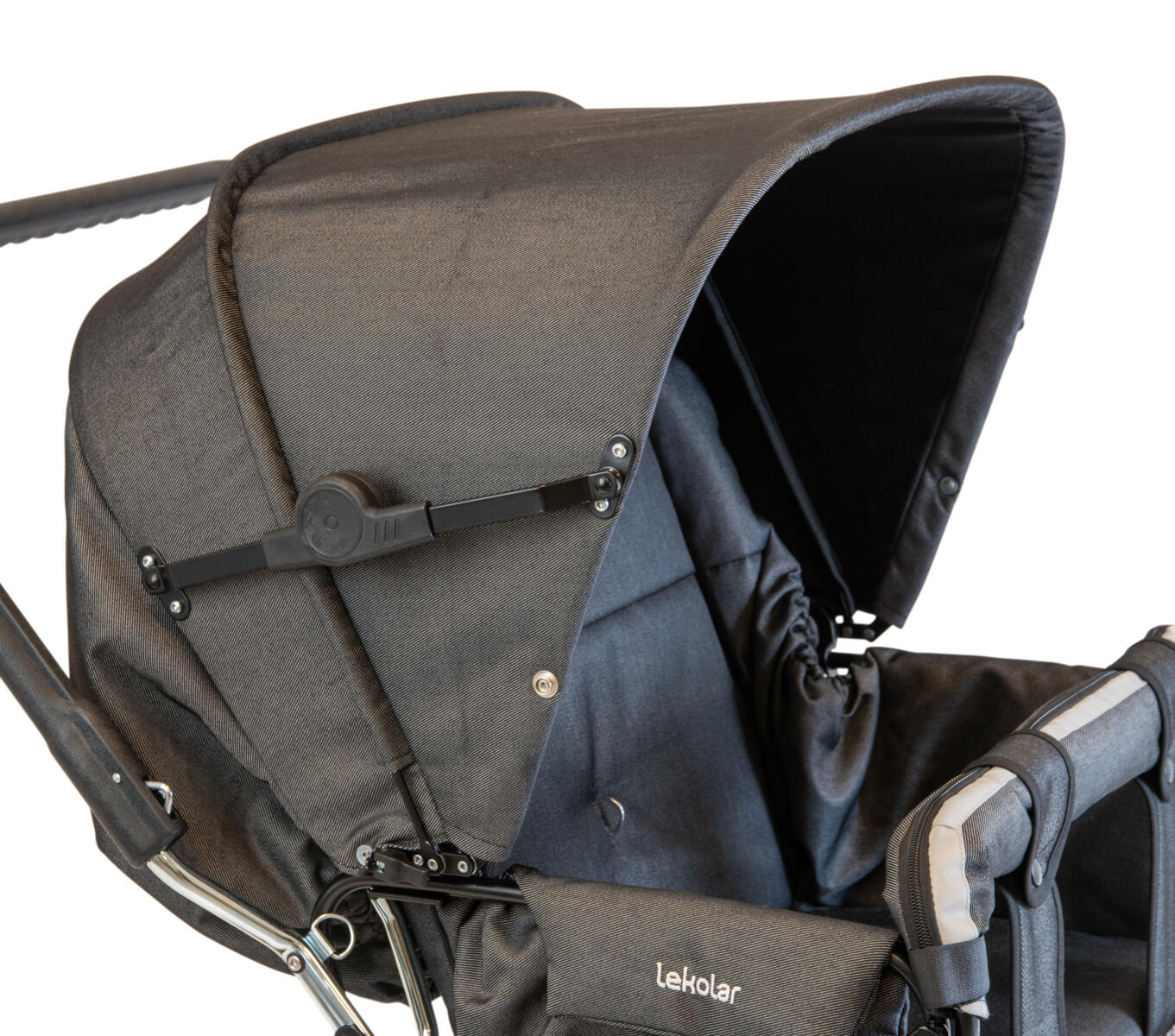 Kaksostenrattaat on verhoiltu kestävällä, vettähylkivällä kankaalla. Istuinosassa on 5-piste-turvavaljaat sekä jalkapeite. Turvavaljaat on kiinnitetty istuimen takaosaan, ei selkänojaan. Istuinta suojaa iso kuomu. Kuomussa ja turvakaaressa on heijastimet. Pyörät ovat puhkeamattomat umpipyörät. Matka taittuu pehmeästi ja rattaita on kevyt työntää, koska jokaisessa pyörässä on jousitus ja isot kuulalaakerit. Pyörät on helppo irroittaa kuljetusta ja säilytystä varten. Työntöaisan korkeus on säädettävissä jokaiselle työntäjälle sopivaksi. Istuimen turvakaaren voi kaataa ja lapset on helpompi nostaa rattaisiin ja rattaista pois. Yksiosaisen selkätuen voi kääntää makuuasentoon. Runko on mustaksi lakattu. Päällinen on polyesteria, ökö-tex-sertifioitu. Päällisen voi irrottaa pesuun. Rattaiden painoraja on 2 x 22 kg, tavarakorin 10 kg.