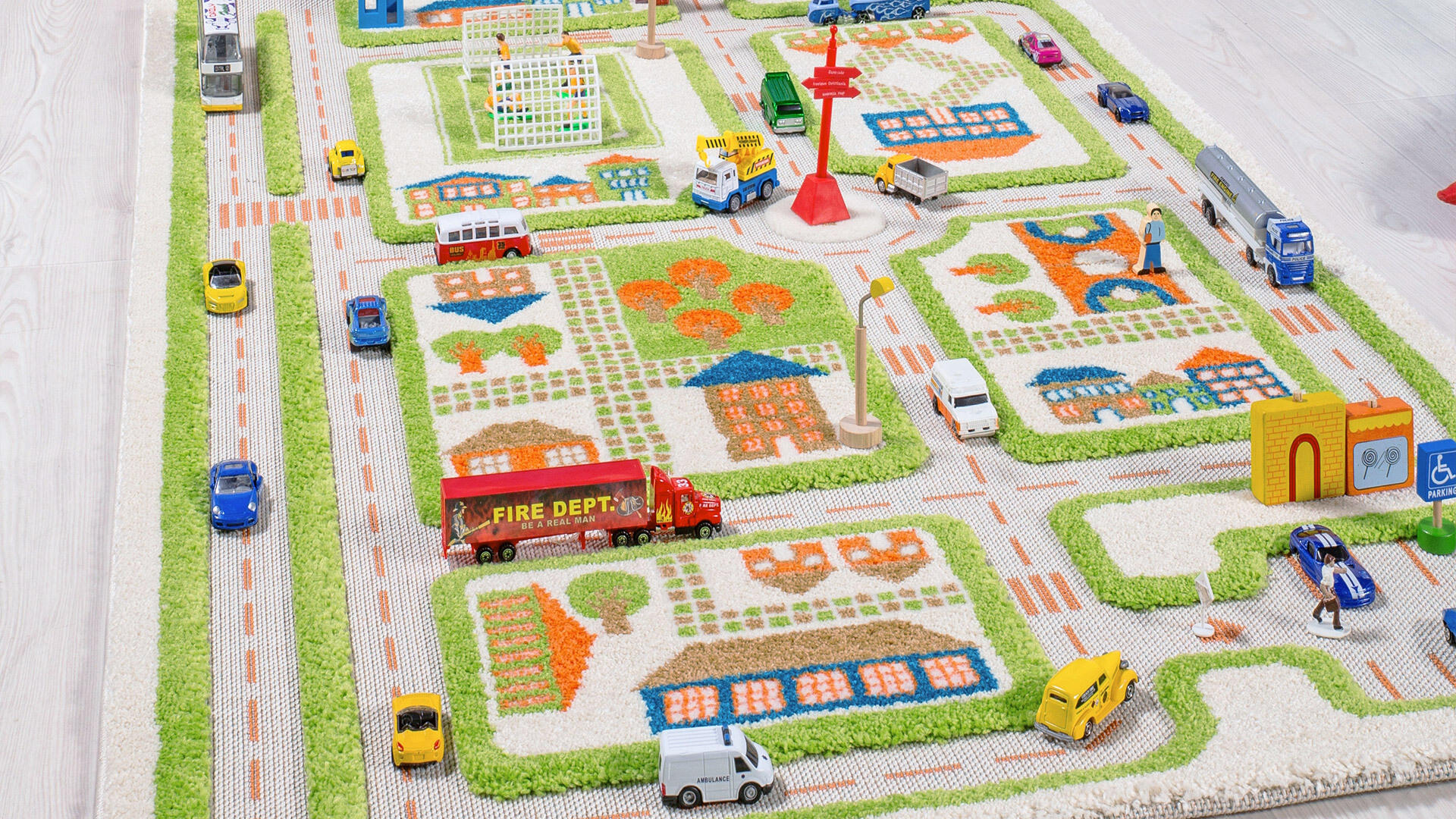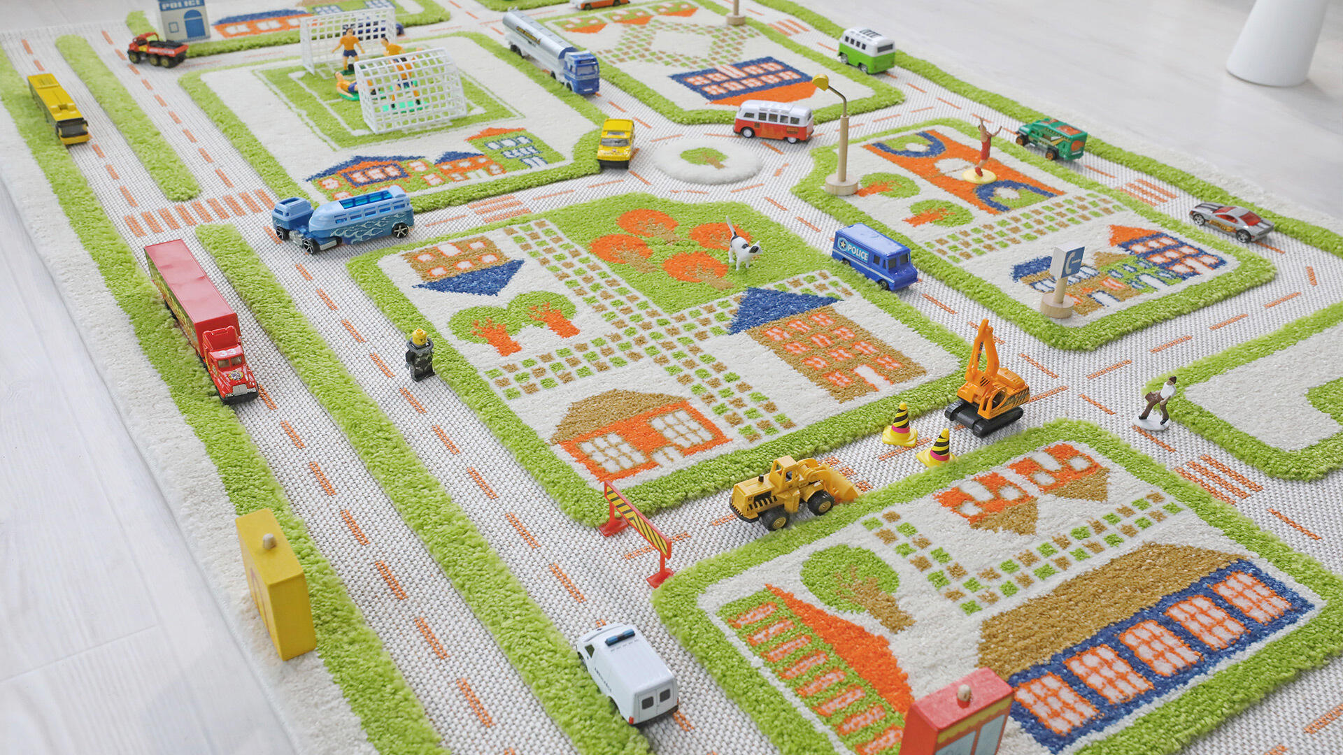Liikennematto, jossa on kolmiulotteinen efekti: upotetut tiet ja kohotettu rakenne. Inspiroi roolileikkiin autojen, talojen ja hahmojen kanssa. Valmistettu polyesteristä ja puuvillasta. Pohja on uritettu, ei liukuesteitä. Kemiallinen pesu. Autot ja tarvikkeet eivät sisälly toimitukseen.