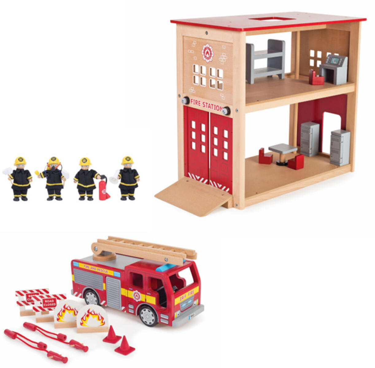 Sisältää kaksikerroksisen paloaseman kalusteineen, paloauton, jossa on nostettavat ja käännettävät tikkaat, sekä pelastajat, joilla on taipuisat kädet ja jalat. Paloasema valmistettu puusta ja paloauto FSC-sertifioidusta puusta. Yli 3-vuotiaille.