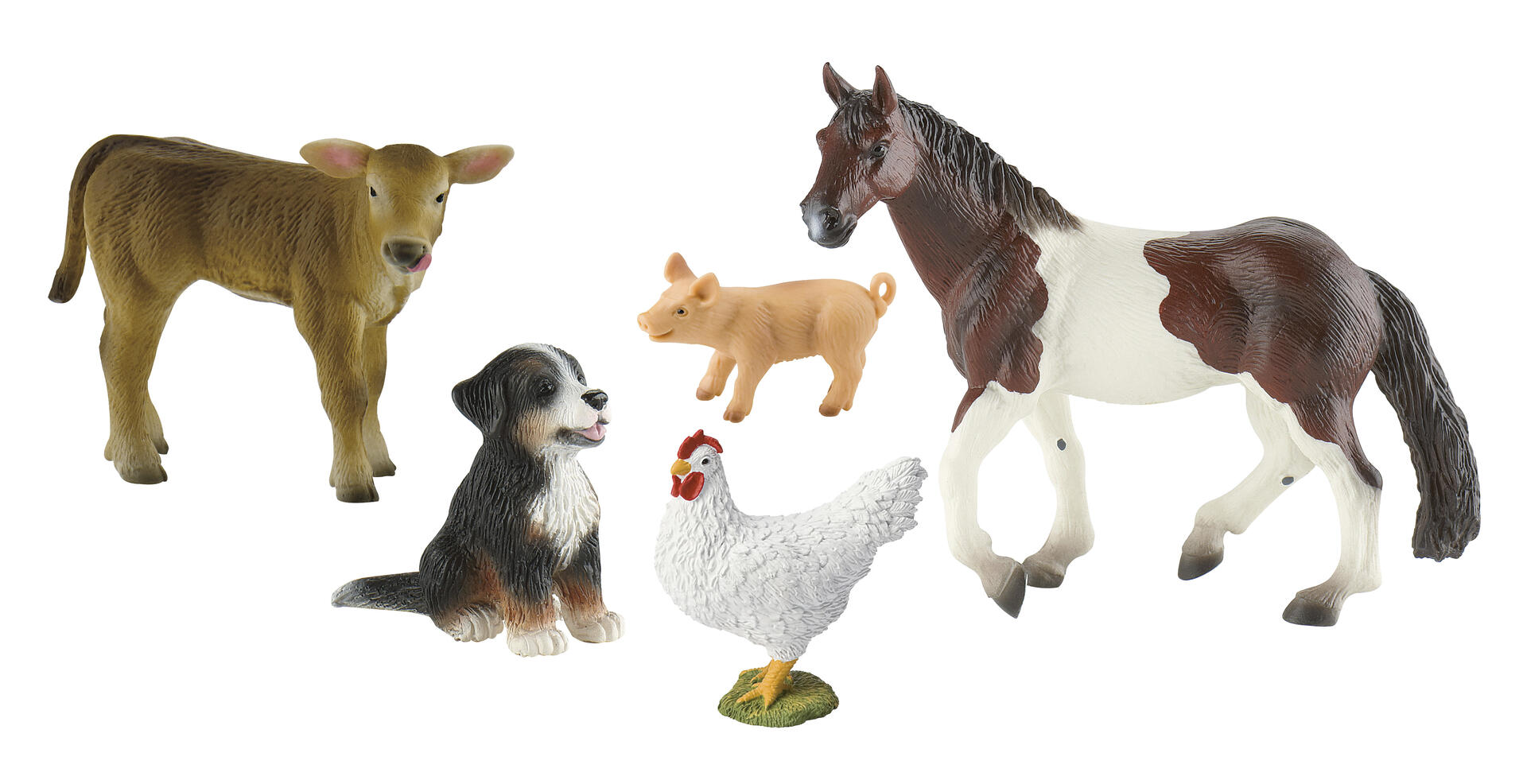 5 erilaista maatilan eläintä. Eläinten ulkonäkö voi vaihdella. Suurimman eläimen mitat 12 cm.
