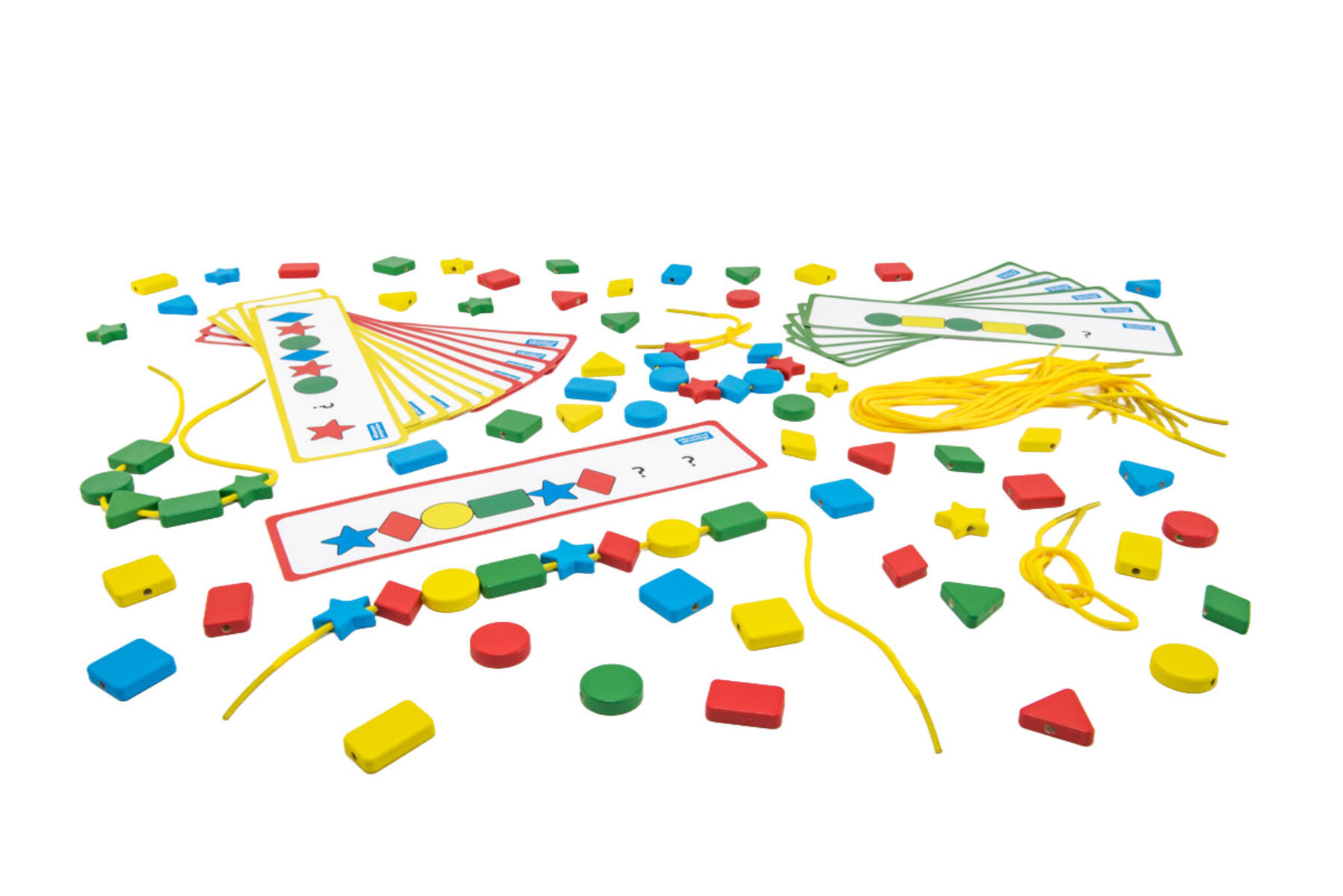 Valitse työkortti ja käännä kortista se puoli ylös, jossa rivi ei ole vielä täydellinen. Anna lapsen pujottaa muodot oikeassa järjestyksessä naruun. Menikö oikein? Sen voi tarkistaa kääntämällä kortin, Harjoittaa muotojen ja värien tunnistamista. Korteissa on kolme eri vaikeustasoa. Pakkauksessa on 72 puumuotoa, 18 työkorttia ja 12 pujottelunarua. FSC-sertifioitua puuta. Yli 3-vuotiaille.