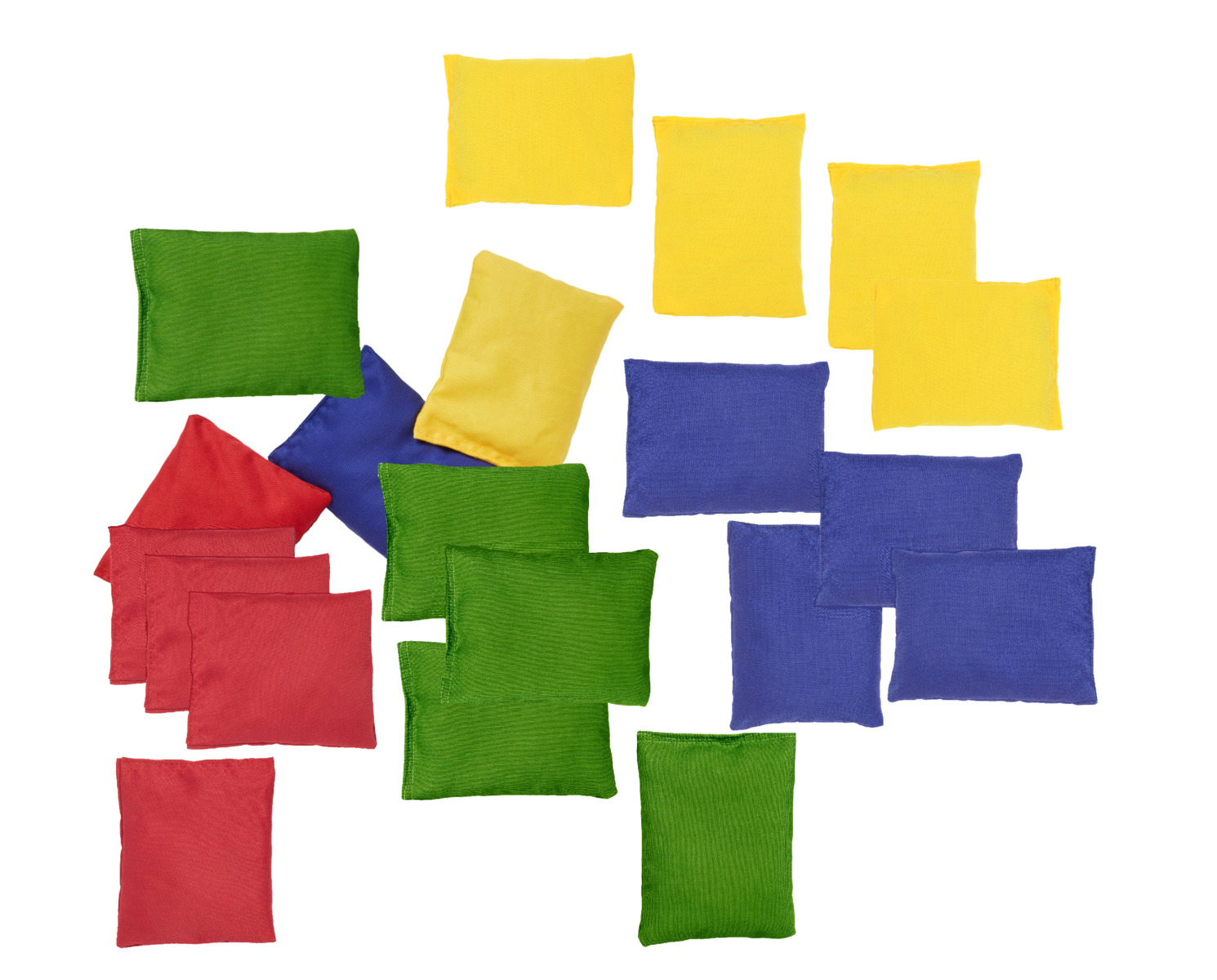 Neljä eriväristä hernepussia, 5 kpl jokaista väriä. Nylonia, sisältää muovipellettejä. Mitat: 12 x 10 cm. Yli 3-vuotiaille.
