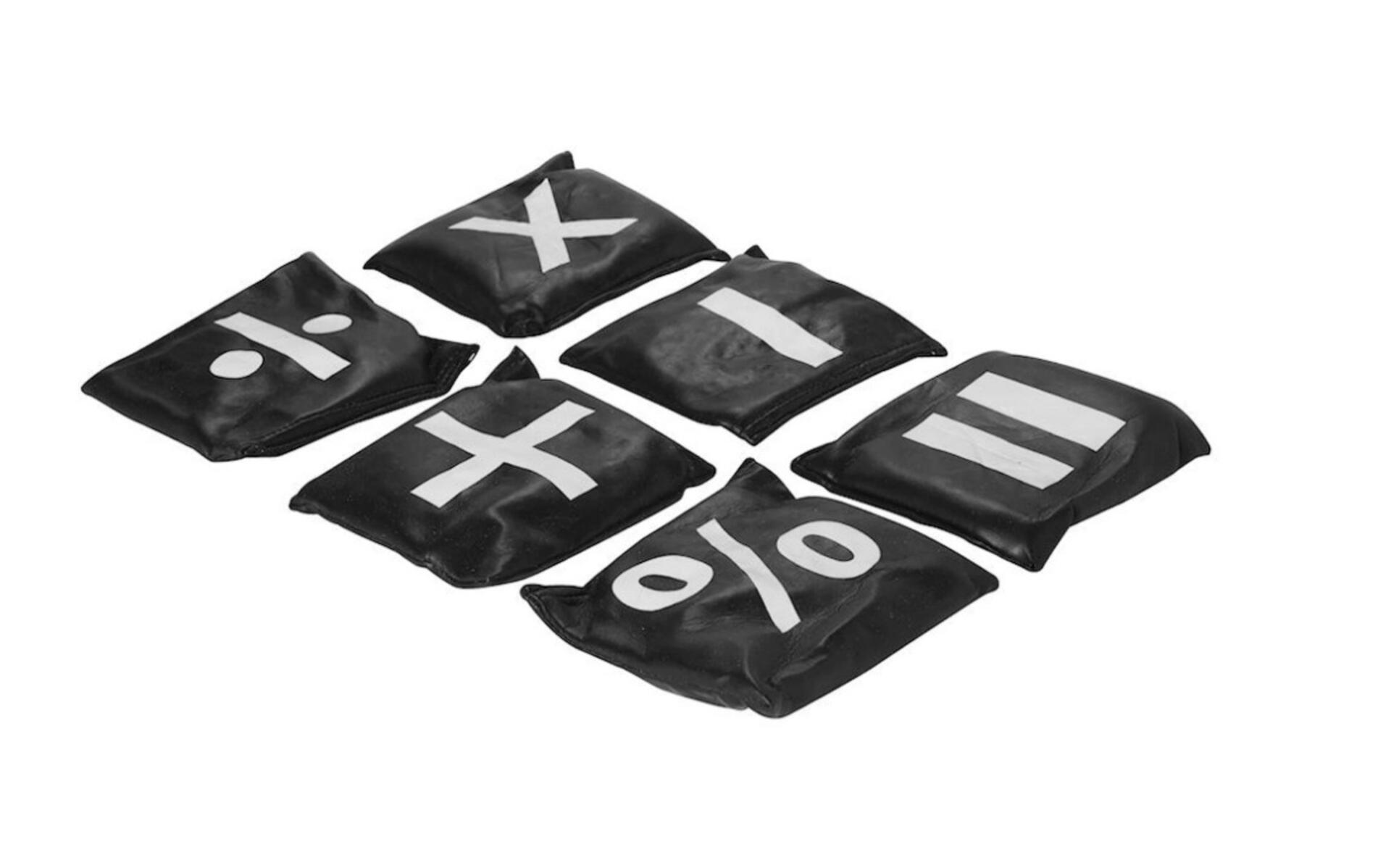 Hyvä lisä matematiikan opetukseen, jossa liike edistää oppimista. Sisältö: miinus, plus, jakolasku, prosentti, yhtäsuuruusmerkki ja kertomerkki. Valmistettu PU-muovista, täytetty PE-muovirakeilla. Mitat: 12 x 12 cm.