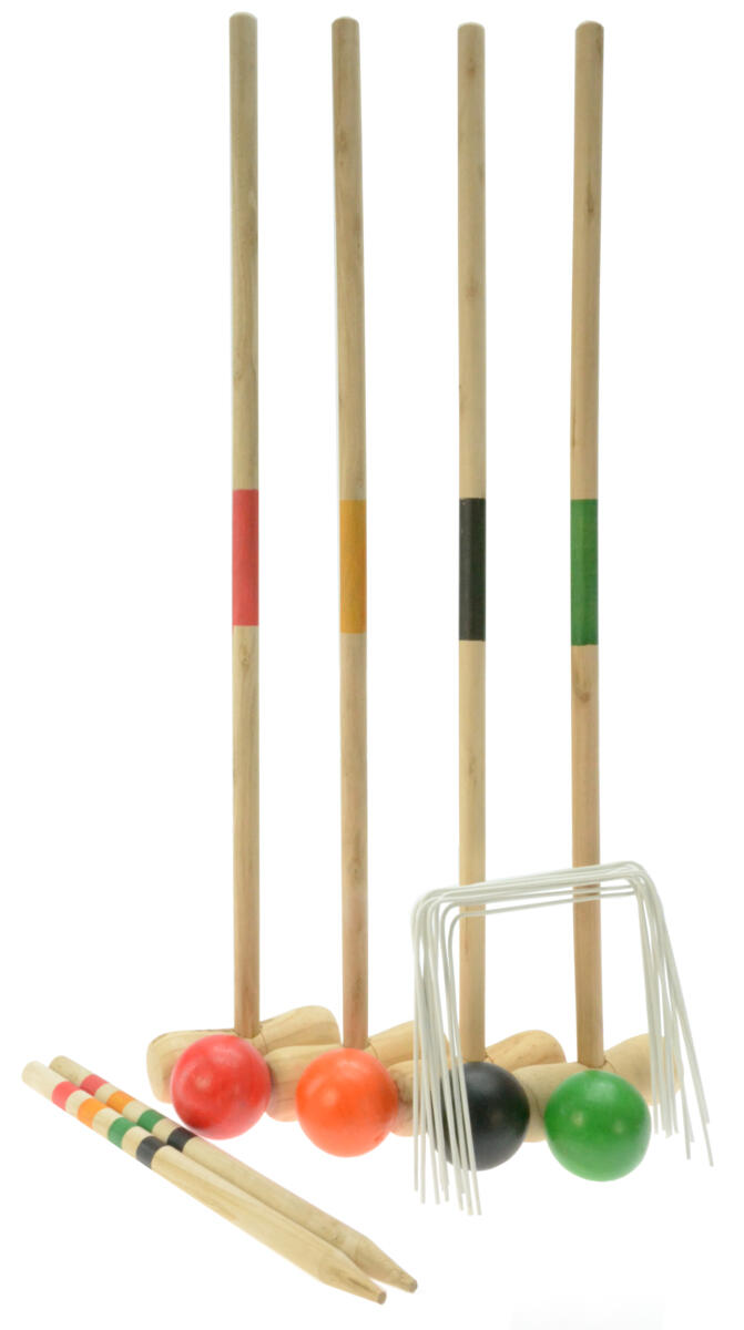 Täydellinen krokettisetti, jossa 4 puumailaa, 4 palloa, 10 porttia ja verkkopussi säilytykseen. Ohjeet mukana.