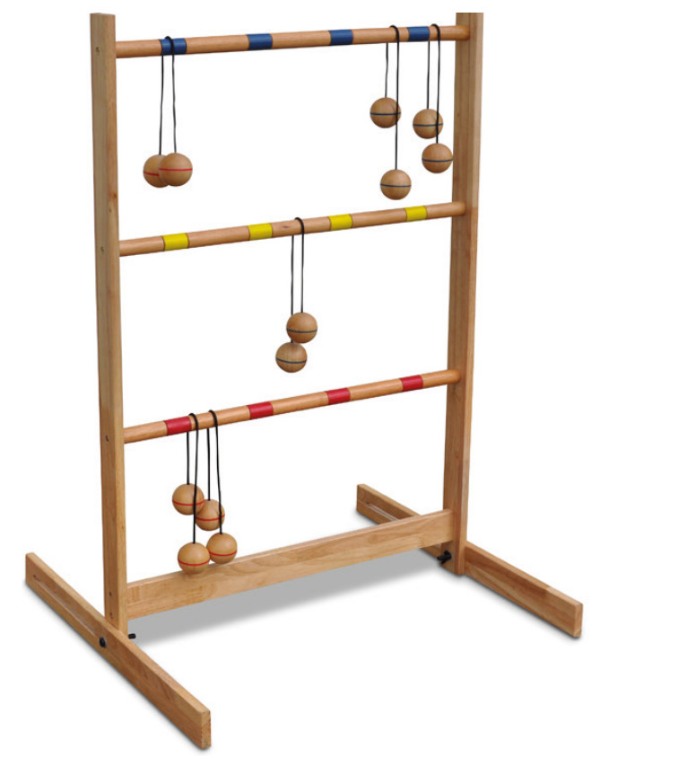 Heittopeli, jossa on tarkoitus heittää toisiinsa narulla yhdistettyjä palloja tikkaille. Sisältää 6 palloparia kahdessa eri värissä ja tikkaat. Tikkaat voidaan taittaa alustasta kuljetuksen ja säilytyksen helpottamiseksi, mukana tulee säilytyspussi palloille. Tikkaiden mitat: 88 x 60 x 57 cm. Pallon mitat: 4,6 cm, narun pituus 30 cm. Materiaali: kumipuu.