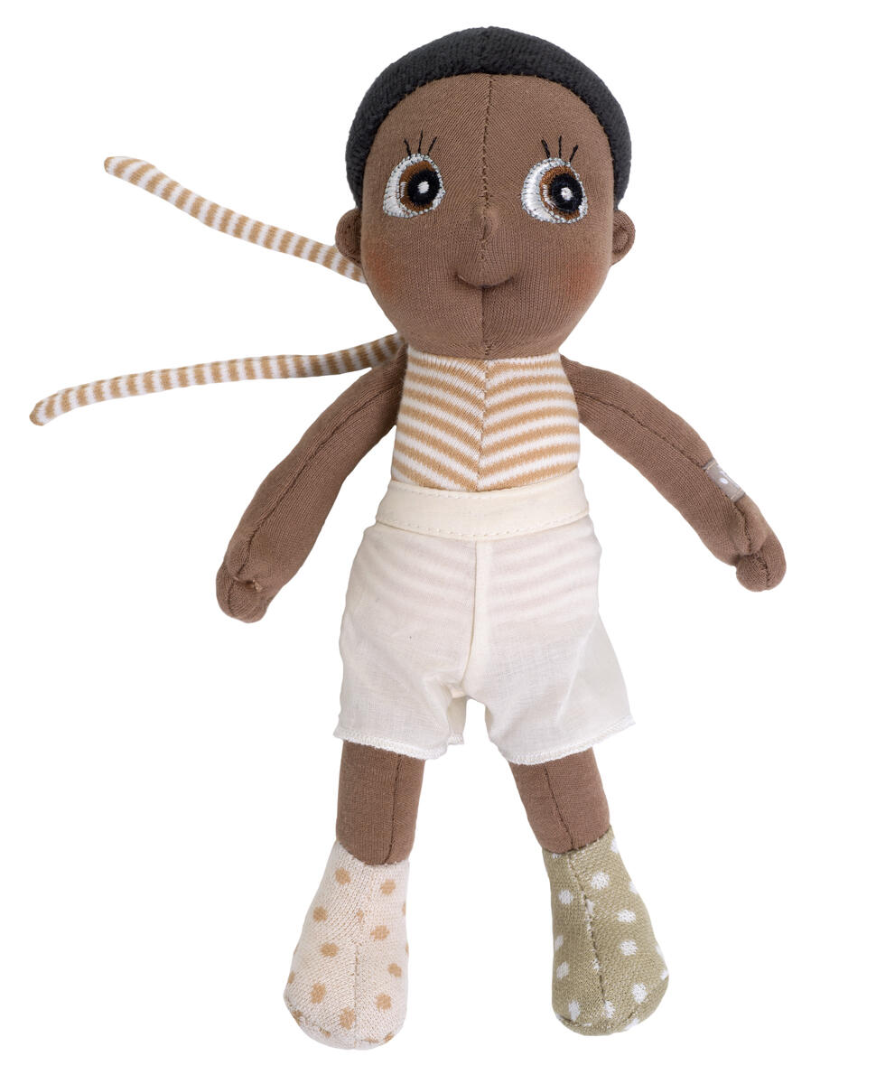 Käsintehty nukke on pehmeä ja halattavan söpö. Nukke ja vaatteet on valmistettu 100 % ekologisesta puuvillasta ja täyte on kierrätettyä polyesteria. Nuken pituus: 23 cm. Kaikenikäisille.