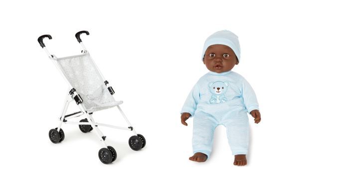 Pehmeävartaloinen nukke ja rattaat, joissa kaksoislukitus ja lakattu metallirunko. Mitat: nuken pituus 40 cm, rattaat 48 x 26 x 53 cm. Nuken kädet, jalat ja pää PVC-muovia, ei sisällä kiellettyjä ftalaatteja. Rattaiden päällinen polyesteriä. Yli 3-vuotiaille.