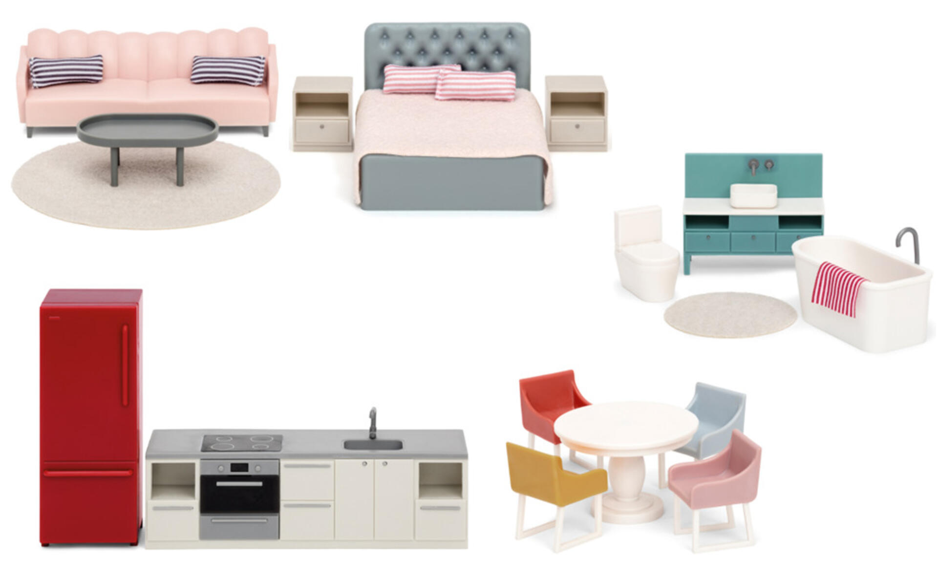 17 osaa. Täydellinen setti Lundby nukkekotiin (tuotenro 135541). Keittiö, kylpyhuone, makuuhuone ja olohuone. Keittiössä ruokapöytä, 4 tuolia, jääkaappi, keittiötaso, jossa on pesuallas, sekä liesi/uuni. Kylpyhuoneessa WC, pesuallas, kylpyamme, matto ja pyyhe. Makuuhuoneessa sänky ja kaksi yöpöytää. Olohuoneessa sohva, sohvapöytä ja matto. Valmistettu muovista.