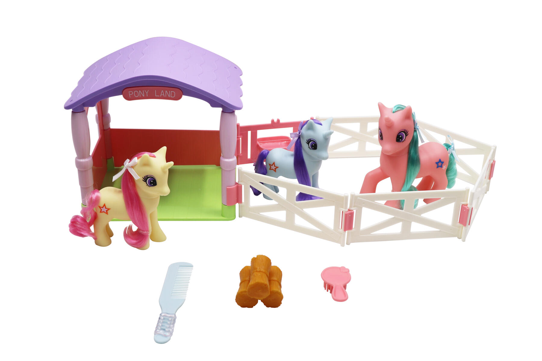 Pakkaus sisältää erikokoisia ja -värisiä poneja. Mukana myös hiuskoristeita ponien harjoihin. PE- ja PVC-muovia, ei sisällä kiellettyjä ftalaatteja. Yli 3-vuotiaille.