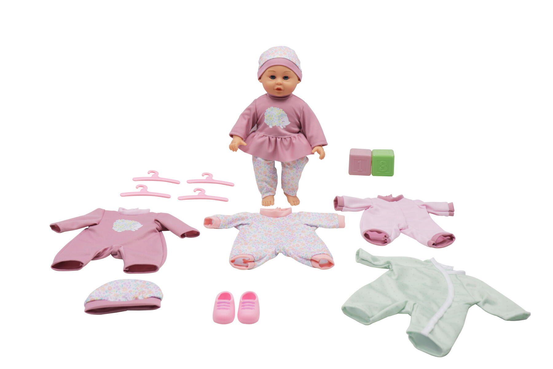 Pehmeävartaloinen nukke, leluja ja kolmet vaatteet. Pituus 35 cm. Nuken pää, kädet ja jalat ovat PVC:tä, ei sisällä kiellettyjä ftalaatteja. Yli 2-vuotiaille.