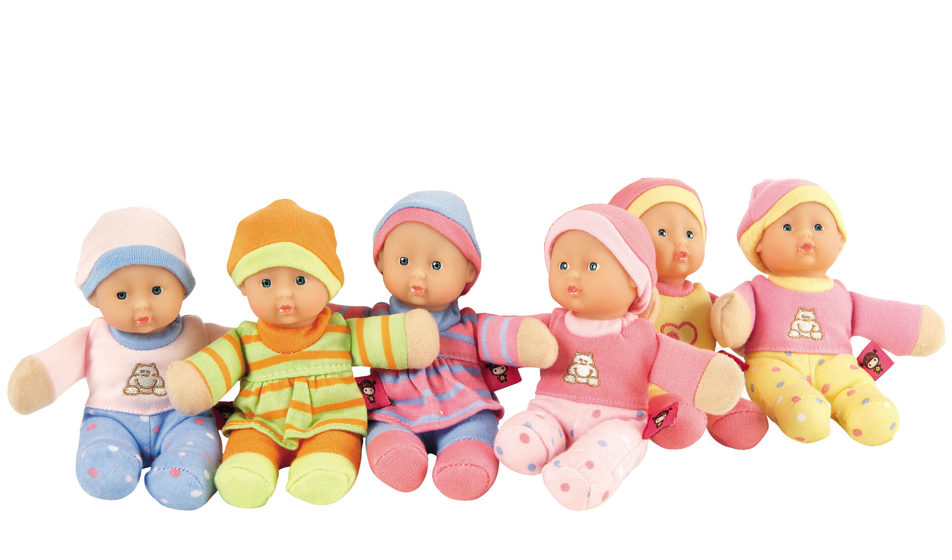 Pehmeä vartalo. Vaatteet, paitsi myssy, on ommeltu kiinni. Pää, jalat ja kädet ovat PVC-muovia, ei sisällä ftalaatteja. Lajitellut mallit. Pituus 15 cm. Yli 3-vuotiaille.