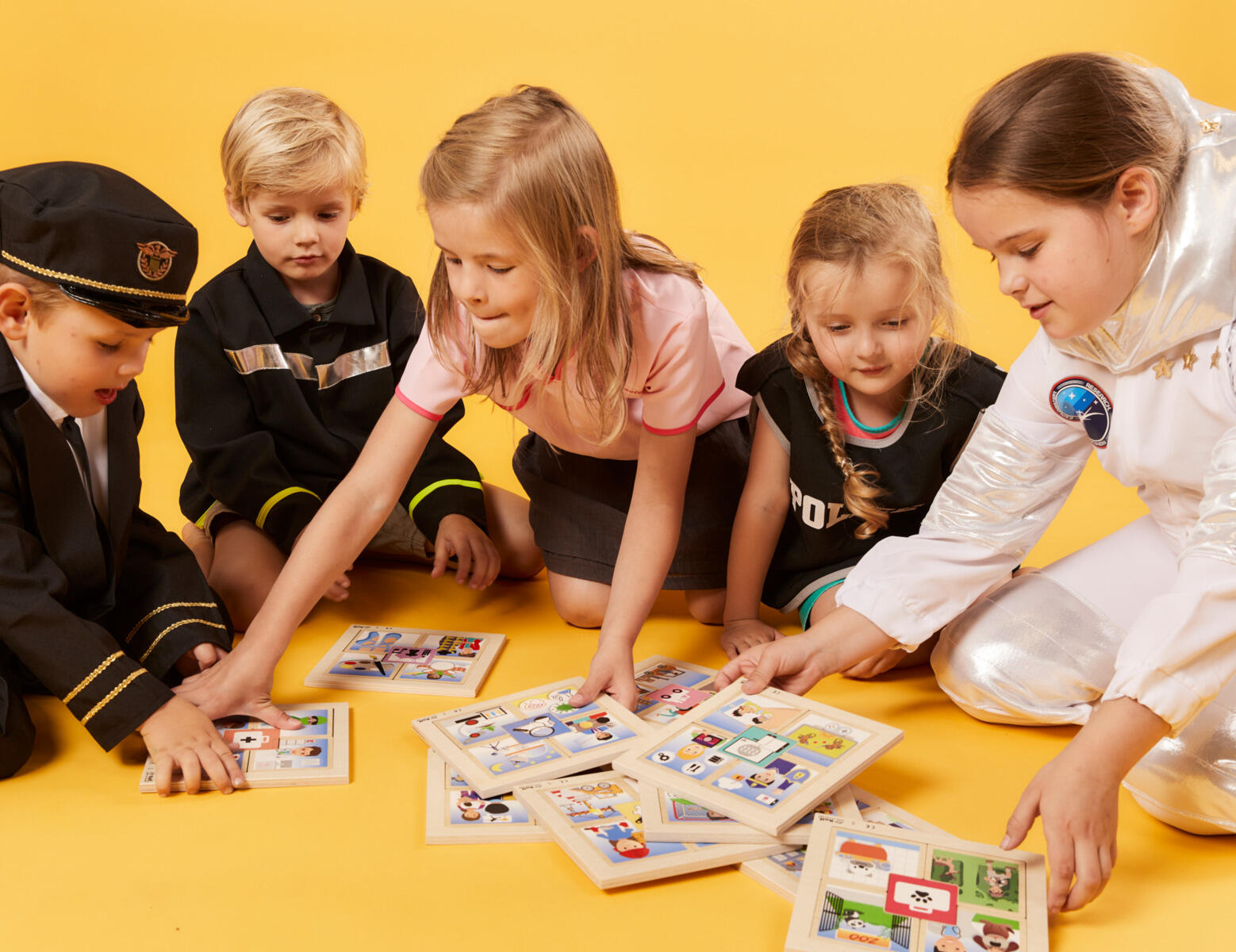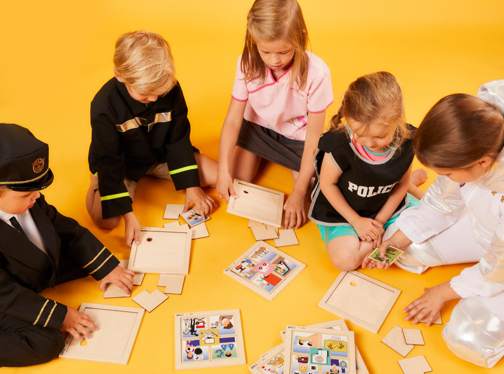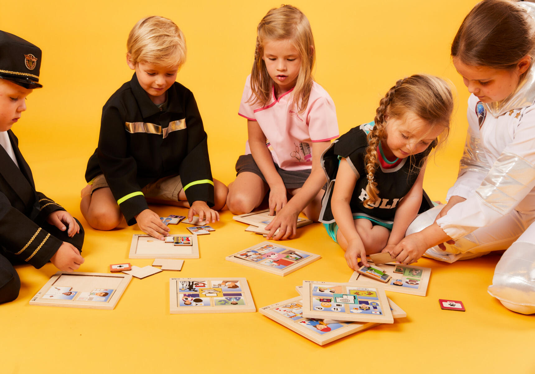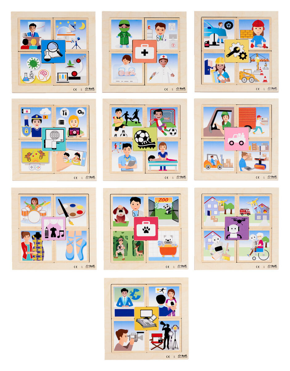 Suuri pakkaus palapelejä, joissa on 3 tasoa. Jokainen palapeli esittää eri ammatteja. Lapset oppivat tuntemaan 40 erilaista ammattia. Mitat: 18 x 18 cm. Materiaali: koivupuu. Yli 4‑vuotiaille.