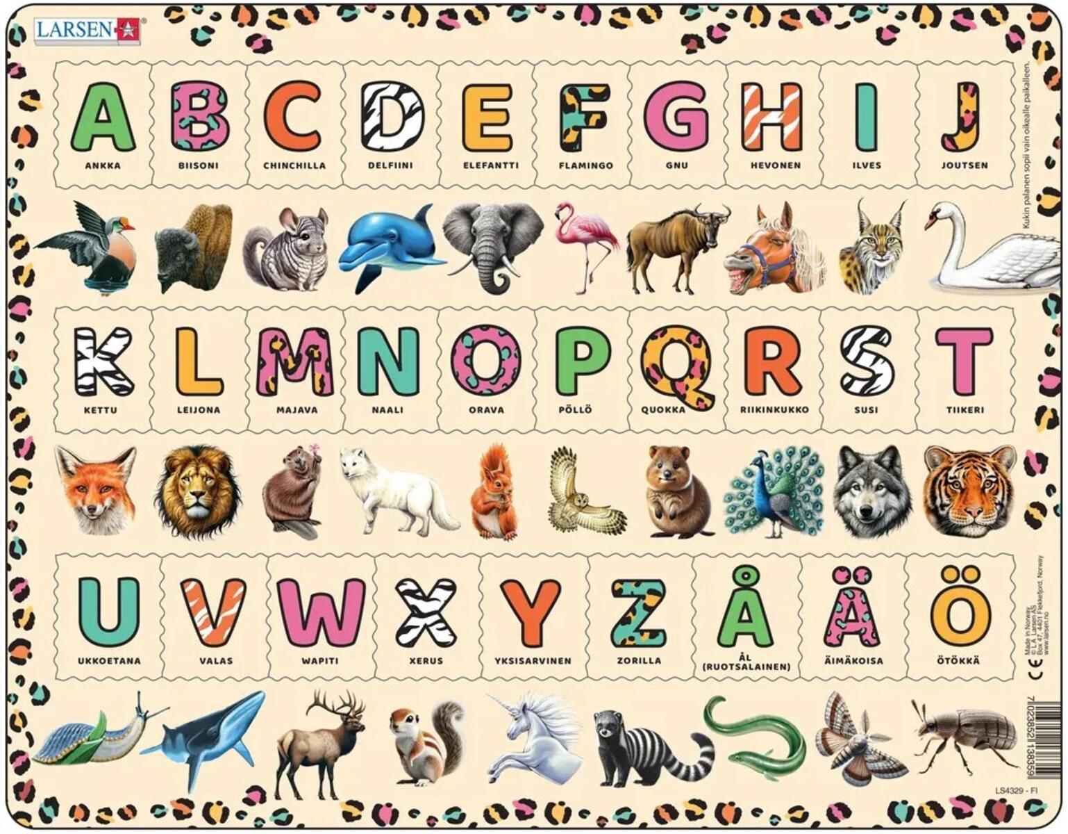 29 palaa. Palapelin avulla lapset oppivat isoja kirjaimia ja aakkosia sekä 29 eläinlajin nimet. Jokaisessa palassa on kirjain ja eläinlajin nimi, sekä alapuolella kyseisen eläimen kuva. Kaikki palat ovat erilaisia ja sopivat vain oikeaan paikkaan. Tällaisen palapelin kanssa lapset voivat yrittää tehdä virheitä. He voivat työskennellä omaan tahtiinsa, keskittyä ja vähitellen oppia yhä enemmän. Jos lapset itse ovat kiinnostuneita, he voivat aloittaa kirjainten oppimisen kolmen vuoden iästä alkaen. Yli 3-vuotiaille.