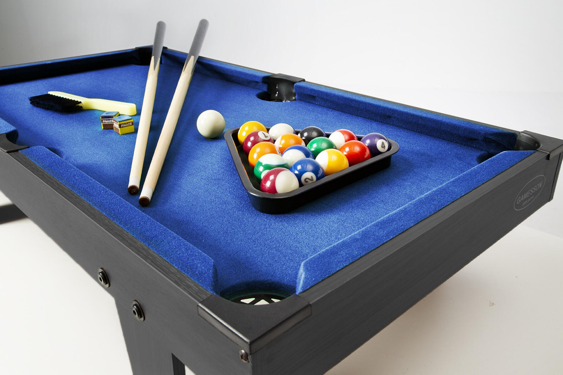 Biljardipöytä pienemmässä mallissa, joka asetetaan olemassa olevalle pöydälle. Ulkomitat: 92 x 42 x 20 cm. Sisältää 2 biljardikeppiä 92 cm, 1 setin palloja (ø 38 mm), kolmion, 2 liitua ja harjan. Valmistettu MDF-levystä, komposiittimateriaalista, puusta ja ABS-muovista. Yli 3-vuotiaille.