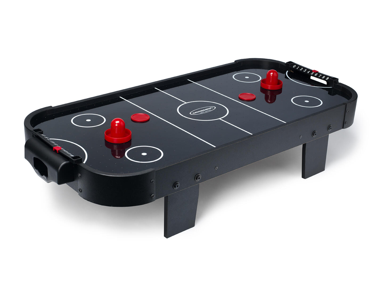 Ilmakiekkopeli pienemmässä mallissa, joka asetetaan olemassa olevalle pöydälle. Ulkomitat: 99 x 46 x 20 cm. Toimii paristoilla, 6 × 1,5 V AA (ei sisälly). Valmistettu MDF-levystä ja polyeteenistä. Yli 3-vuotiaille.