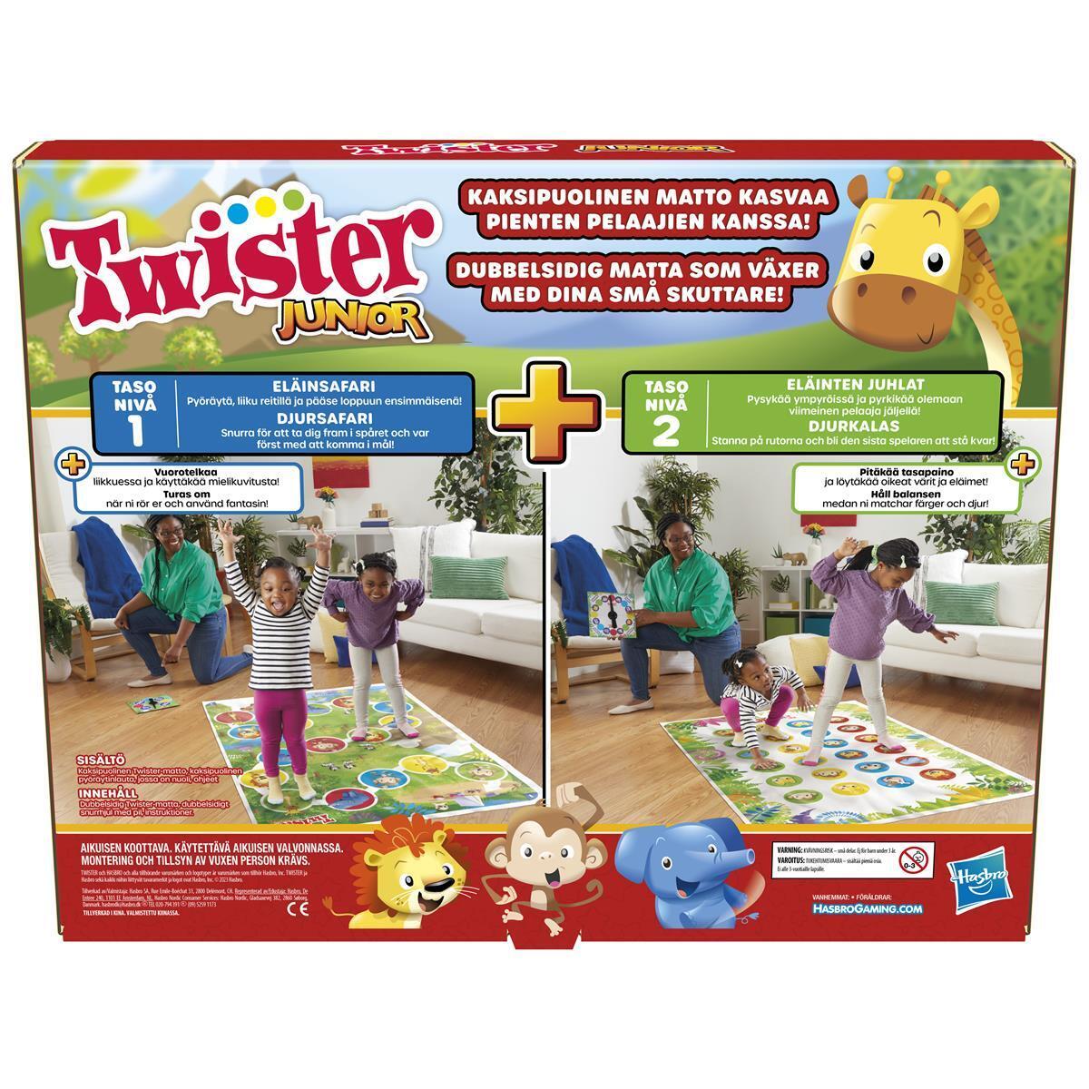 Valmistaudu raikuvan riemukkaaseen ajanviettoon Twister Junior -pelin parissa – tämä on eläinseikkailu, joka kasvaa pienten ikiliikkujien tahdissa! 2-tasoinen peli sisältää 2-puolisen maton ja käännettävän pyöräyttimen. Maton taso 1 on eläinsafaripuoli, jossa lapset liikkuvat safarireittiä pitkin. Jokainen lapsi pääsee omalla vuorollaan tutustumaan väreihin ja matkimaan eläinten ääntelyä ja liikkeitä. Kun lapset kehittyvät, käännä matto ja aloita tason 2 eläinjuhlat. Pyöräytä pyöräytintä ja katso, mihin väriin ja eläimeen pelaajien on pantava jalkansa tai kätensä. Viimeinen pystyssä pysyvä pelaaja voittaa! 2-4 pelaajalle. Yli 3-vuotiaille.