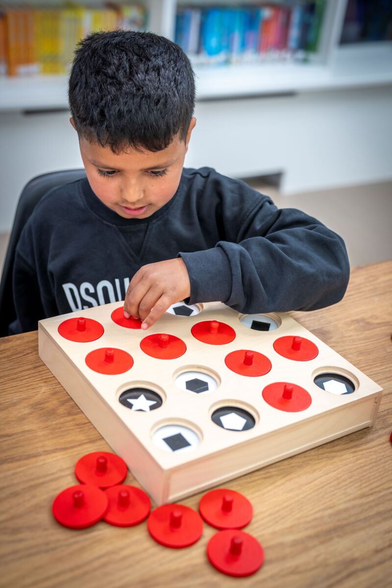 Aseta tehtäväkortti pelilaudan ylimpään hyllyyn ja yritä löytää parit nostamalla punaisia ympyröitä. Kehitä silmä-käsi koordinaatiota, tilahavaintoa ja kykyä erottaa yksityiskohtia. Sisältö: 8 muovista tehtäväkorttia, 16 puista punaista ympyrää nupeilla ja puinen pelilauta/säilytyslaatikko. Pelilaudan mitat: 32 x 32 x 6 cm. Yli 3-vuotiaille.