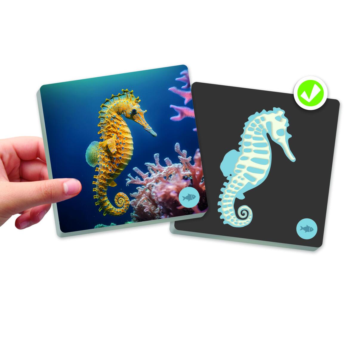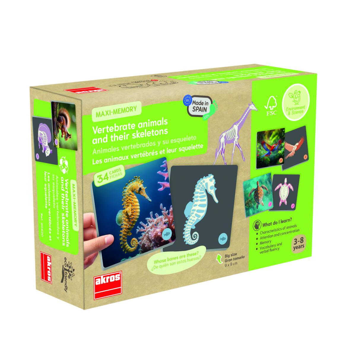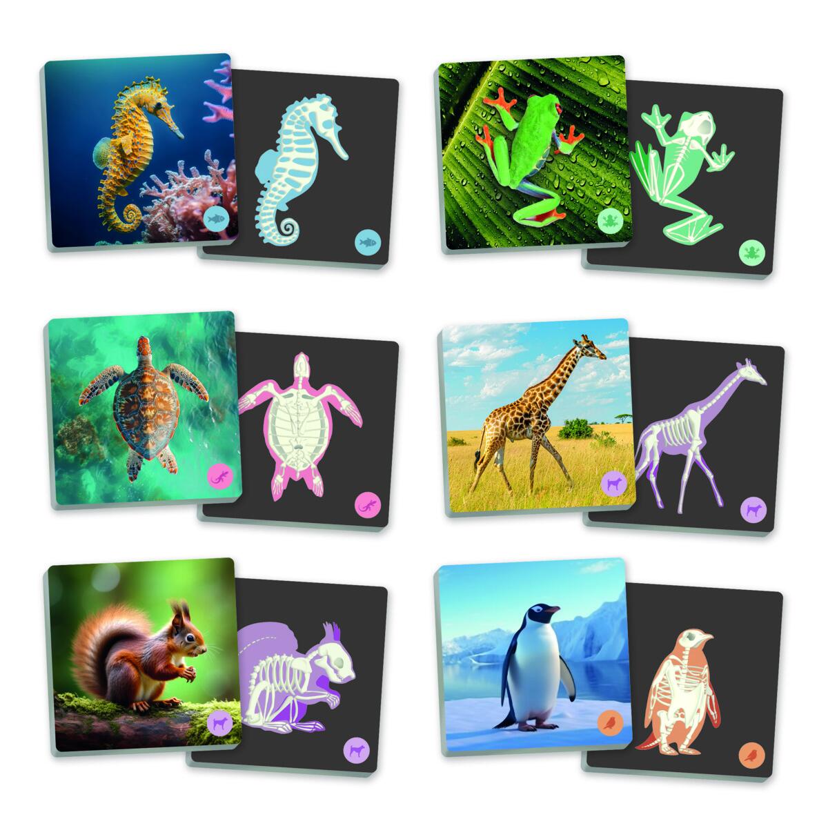 Toisessa kortissa on eläin ja toisessa eläimen luuranko. Lapset harjoittavat muistiaan ja näkevät eroja eläinryhmien välillä. 34 korttia. Kortin koko 9 x 9 cm. Raaka-aine FSC-merkitty. Yli 3-vuotiaille.