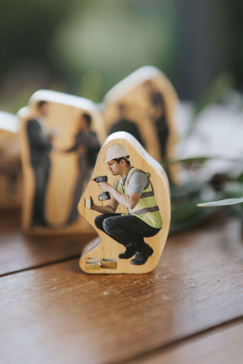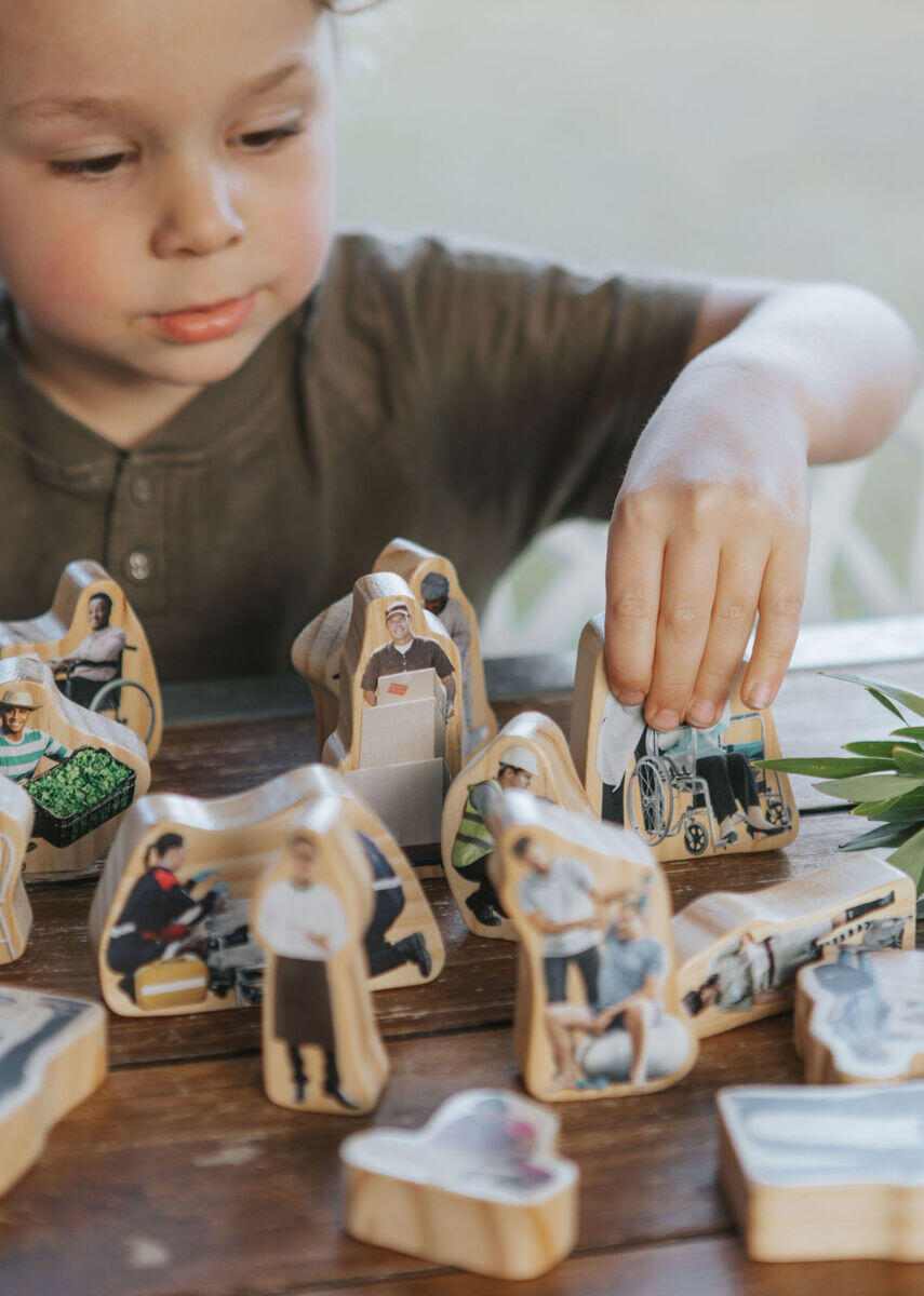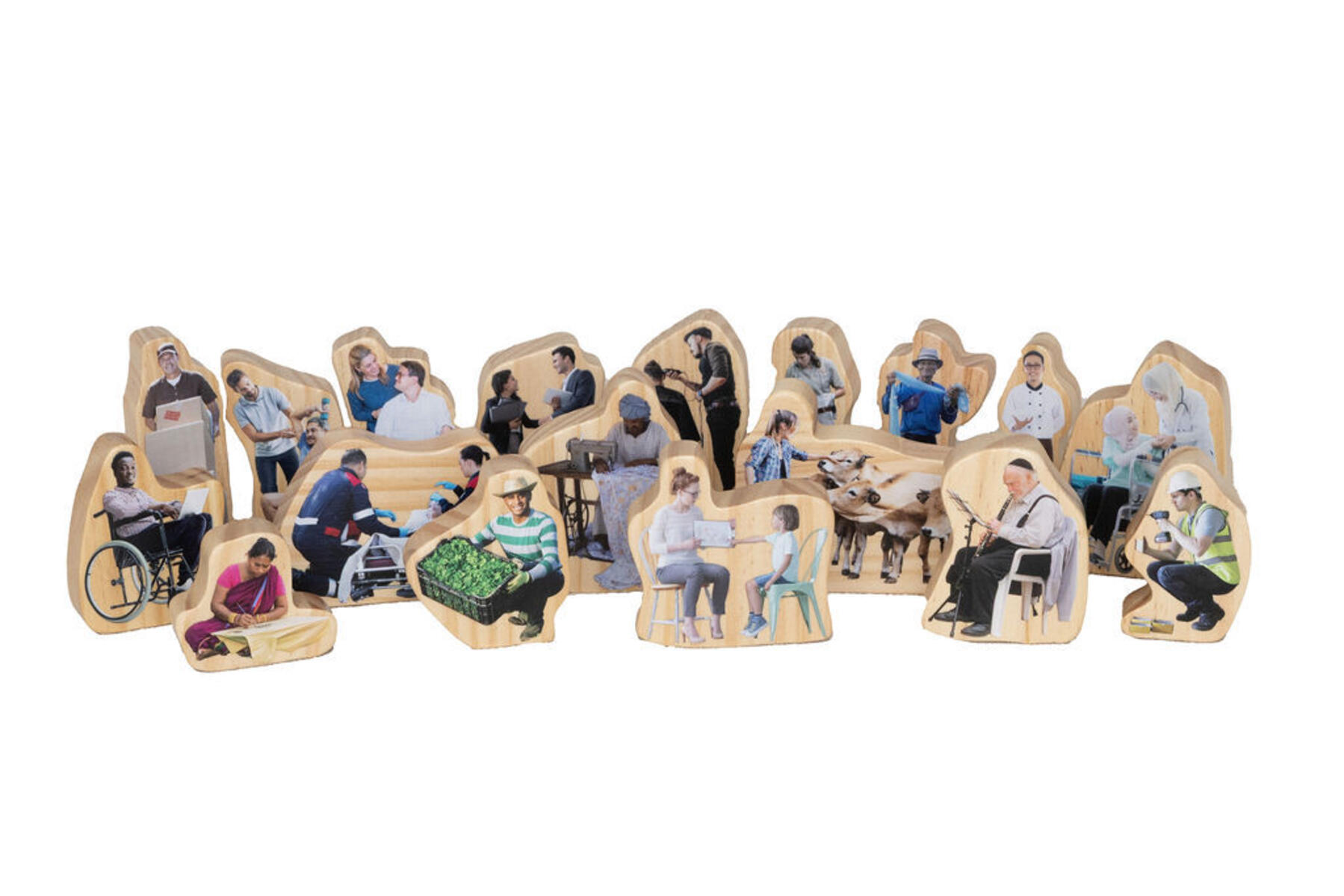 Puualustalle painetut hahmot edustavat ammatteja, jotka saavat maailmamme toimimaan. Palomiehiä, lääkäreitä, kokkeja, opettajia ja postinkantajia. Hahmot sopivat erinomaisesti leikkeihin tai aloituspuheeksi yhteiskunnastamme. Mitat: pienin 6,5 x 4,5 x 2 cm, suurin 11,5 x 7,5 x 2 cm. Yli 1-vuotiaille.