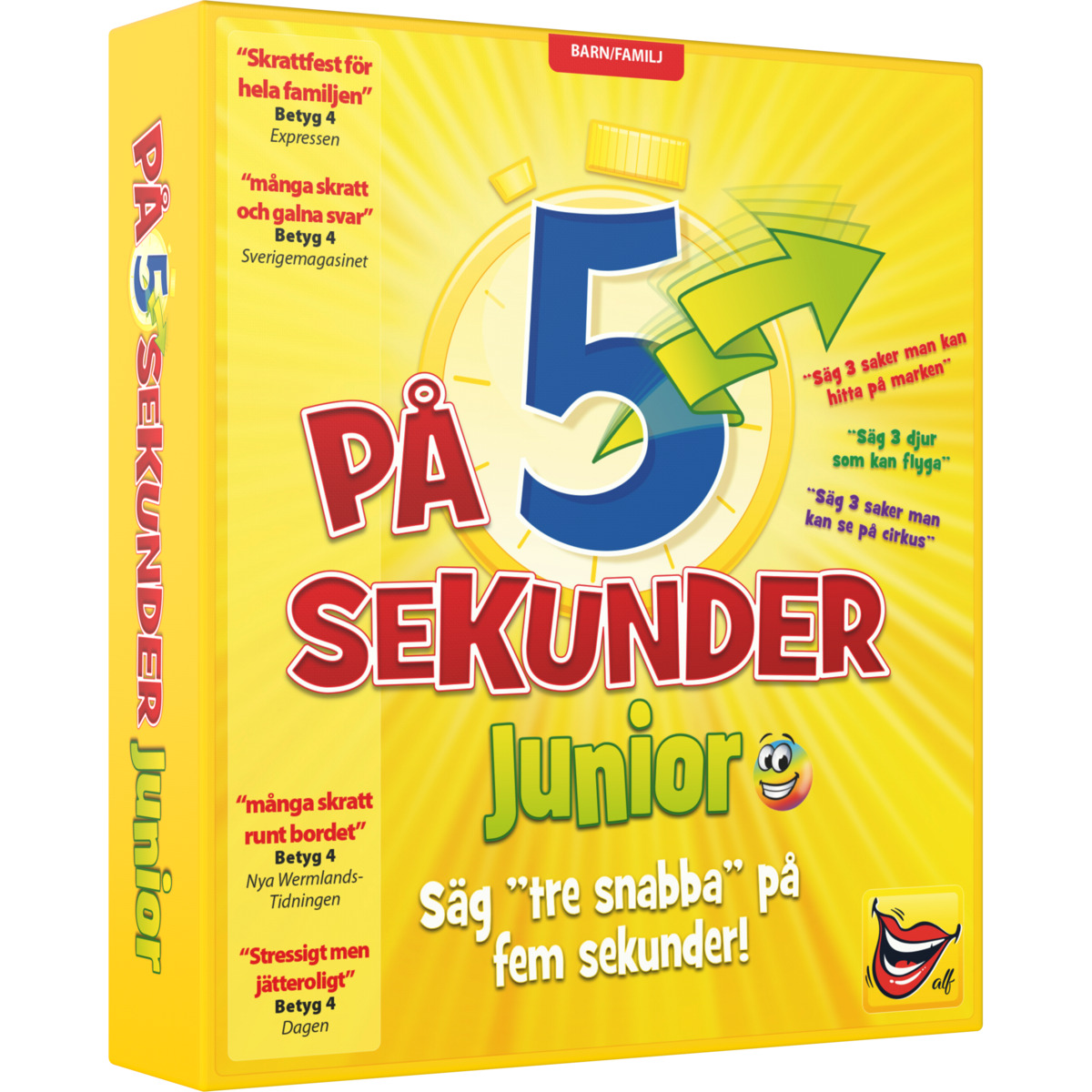 Ruotsinkielinen. Säg tre saker som får plats under sängen, tre saker som kan flyga eller tre djur som har lång svans. Du måste hinna säga alla tre sakerna på 5 sekunder. Ett fartfyllt spel med enkla regler. För 3-6 spelare. Speltid ca 20 minuter. PVC-fri. Rekommenderas från 6 år.