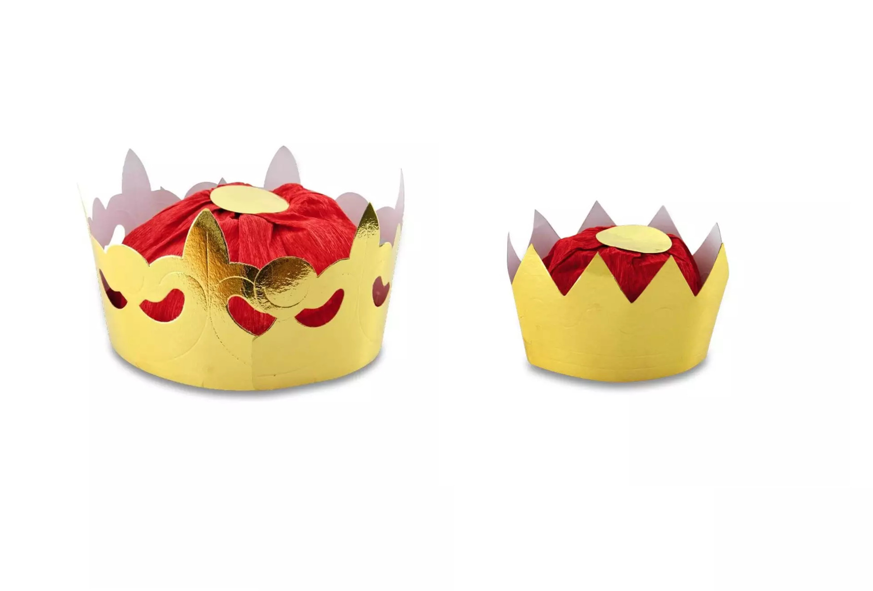 Isomman kruunun korkeus on 11 cm ja halkaisija 19 cm, pienemmän korkeus on 7 cm ja halkaisija 9 cm. Valmistettu kartongista ja punaisesta kreppipaperista, ja siinä on joustava nauha.