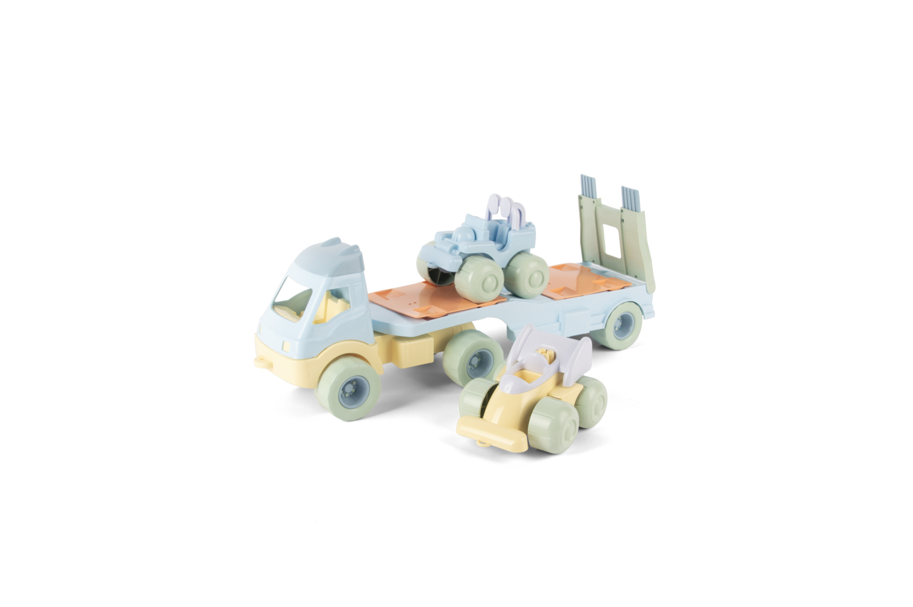Autokuljetusrekka kahdella kierrätysmuovista valmistetulla autolla. Perävaunussa on autoramppi, jonka voi taittaa ylös ja alas. Sopii sekä ulkona että sisällä leikkimiseen. Mitat: kuljetusauton pituus 53 cm, autojen 17 cm. Lelut kestävät pakkasta ja ne voi pestä tiskikoneessa. Joutsenmerkki, lisenssinumero 50950001. Yli 2-vuotiaille.