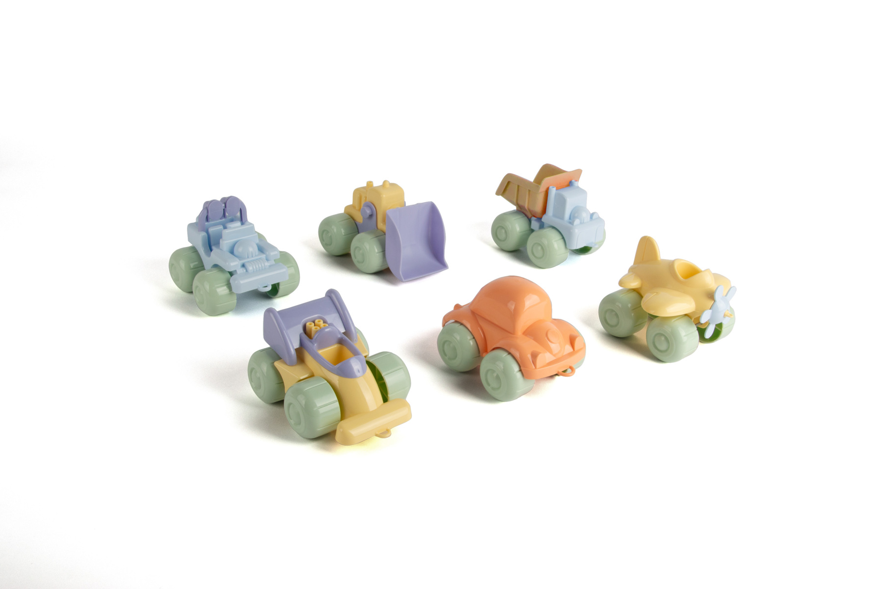 Erilaisia kierrätysmuovista valmistettuja ajoneuvoja. Sopii sekä ulkona että sisällä leikkimiseen. Lajitellut mallit, tuplia voi esiintyä. Mitat: pituus 17 cm. Lelut kestävät pakkasta ja ne voi pestä tiskikoneessa. Joutsenmerkki. Yli 2-vuotiaille.