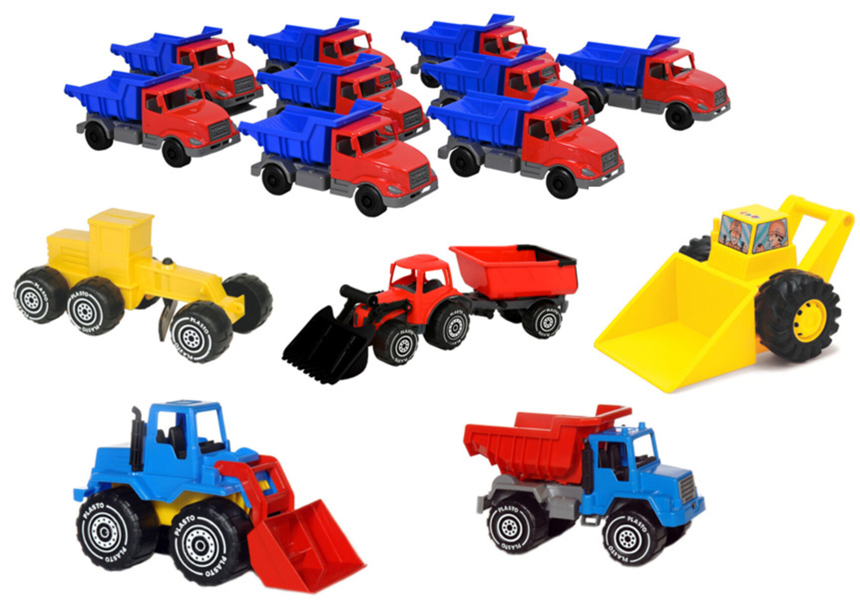 Suurpakkaus työajoneuvoja hiekkaleikkiin. Liikkuvien osien, kuten kallistettavan kuormalavan ja ajoneuvojen kauhojen avulla, leikistä tulee todellisempaa. Sisältö: 9 kuorma-autoa pituus 18 cm (poikkeavat kuvasta), kauhatraktori pituus 48 cm, kauhakuormaaja pituus 24 cm, tietyöajoneuvo pituus 52 cm, kaivinkone kahvalla pituus 30 cm ja tielana pituus 19 cm. Polyeteenimuovia. Yli 2-vuotiaille.
