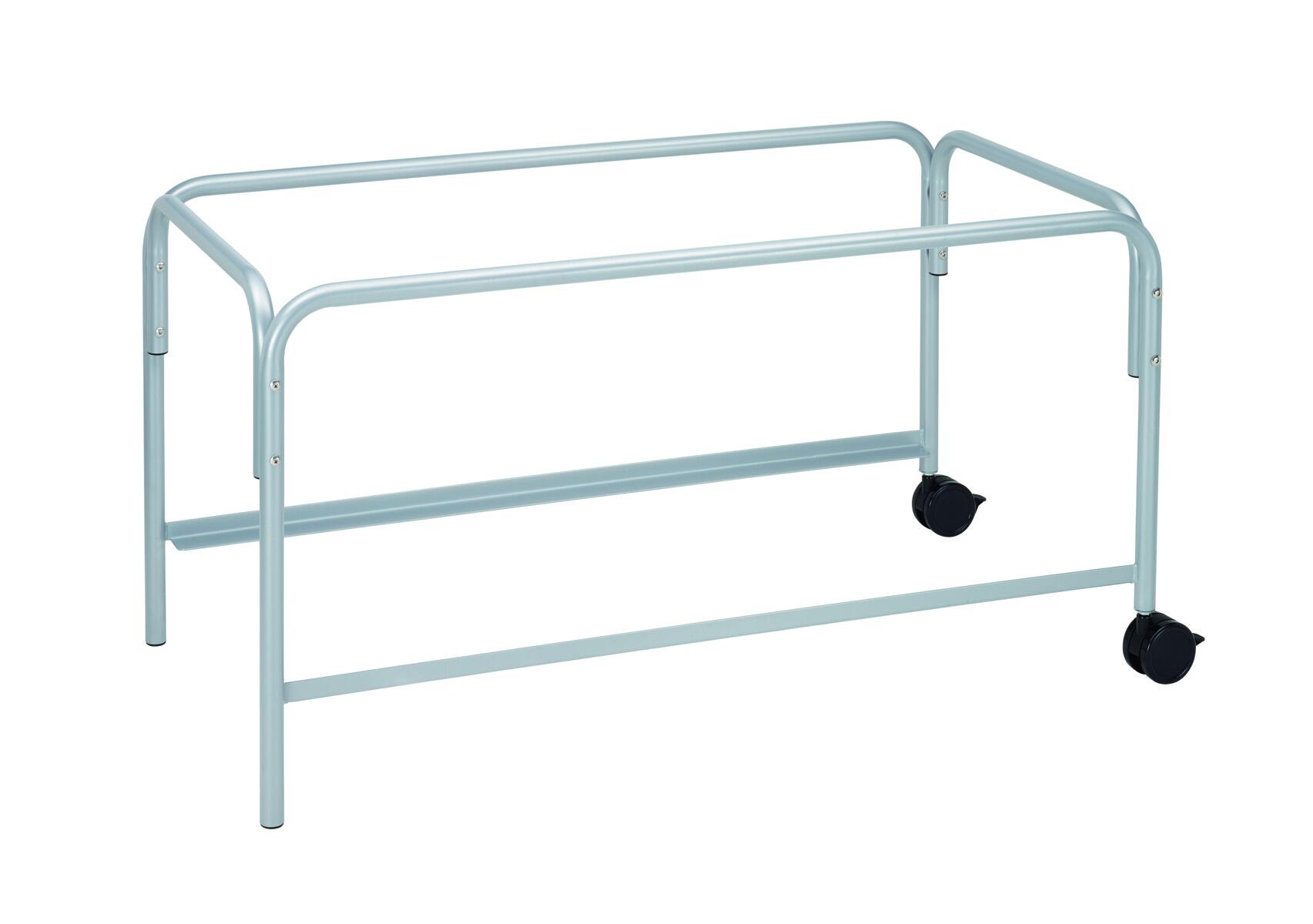 Korkea jalusta hiekka- ja vesileikkialtaalle 138728. Korkeus 58 cm ja pyörät yhdellä lyhyellä sivulla helpottamaan siirtämistä. Materiaali: teräs.