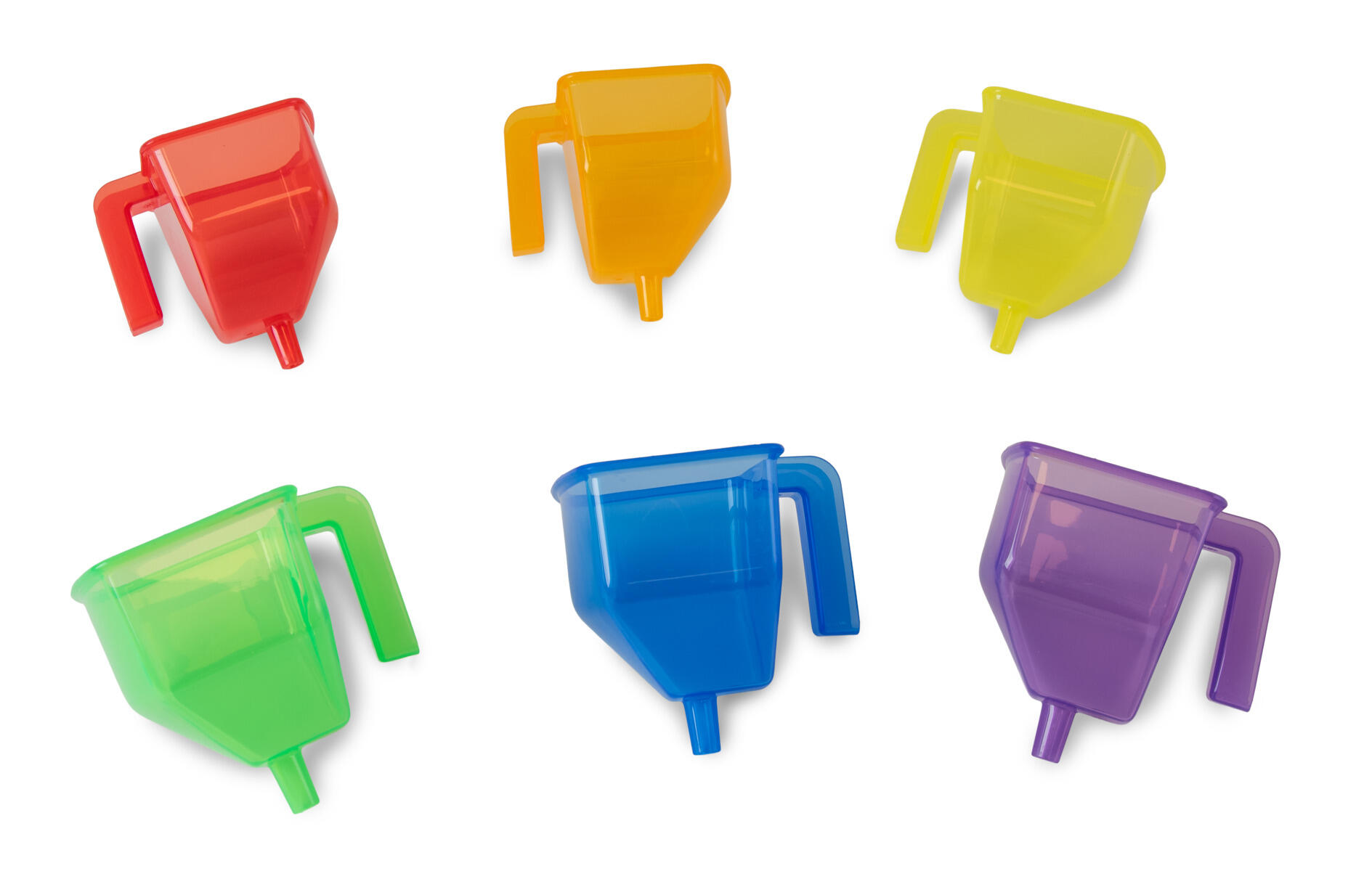 Kaatimet ovat sopivan kokoiset lasten käyttöön. Läpinäkyvässä kaatimessa on mitta-asteikko 50 - 300 ml. Kaatimia voi käyttää erilaisissa kokeissa, mittauksessa ja vesileikissä. Pakkaus sisältää 6 erilaista väriä. ABS-muovia. Mitat: 11,3 x 7,7 cm. Yli 1,5 -vuotiaille.