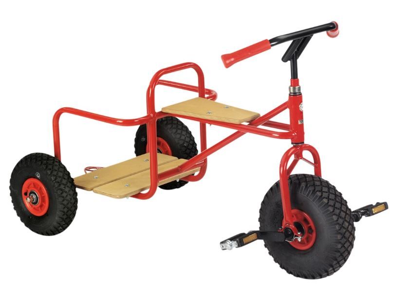 Suosittu malli, joka sopii erinomaisesti roolileikkeihin. Kolmipyörä on varustettu raskailla renkailla, takaistuimella, vetokoukulla ja turvakahvalla, josta ylimääräinen matkustaja voi pitää kiinni. Mitat: 107 x 66 x 71 cm (LxSxK). Istuinkorkeus 42/32 cm. Toimitetaan valmiiksi koottuna. Valmistettu teräksestä sekä PP- ja PU-muovista. Istuin ja jalkalevy FSC-sertifioitua puuta. Ikäsuositus: yli 4-vuotiaille.