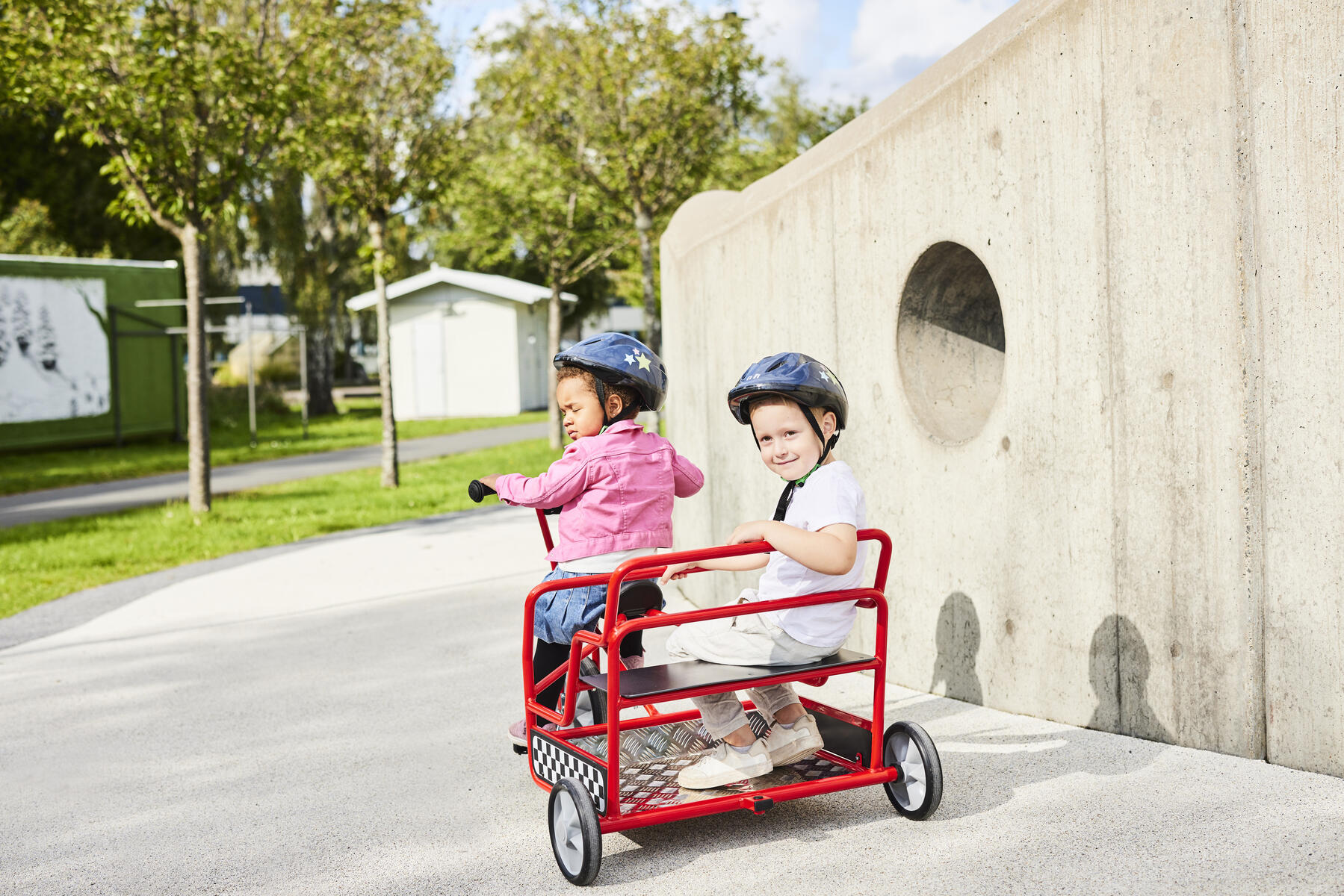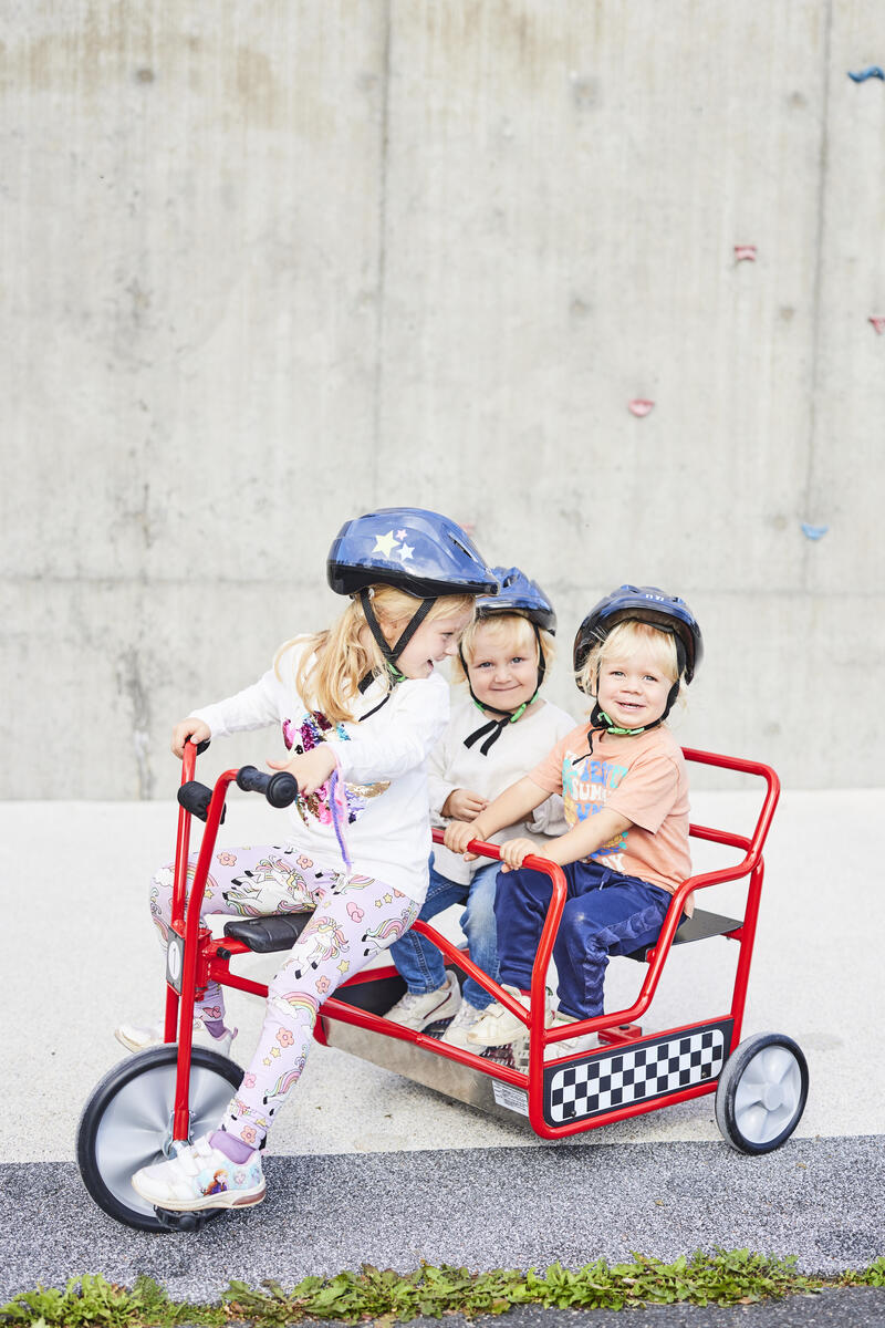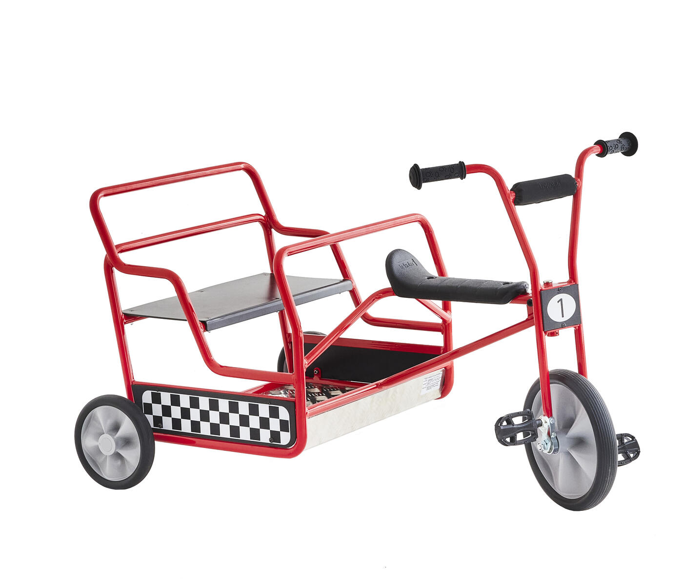 Tuttu taksipyörä on maalattu kilpapyöräksi, kyytiin mahtuu kaverikin. Hauska pyörä kehittää lasten yhteistyökykyä ja vuorovaikutustaitoja. Etu- ja takapyörän kuulalaakerit keventävät polkemista. Jalkataso on kestävää alumiinia. Mitat: 112 x 59 x 71 cm (LxSxK). Istuinkorkeus 43 cm. Toimitetaan valmiiksi koottuna. Ikäsuositus: 4–8 -vuotiaille.