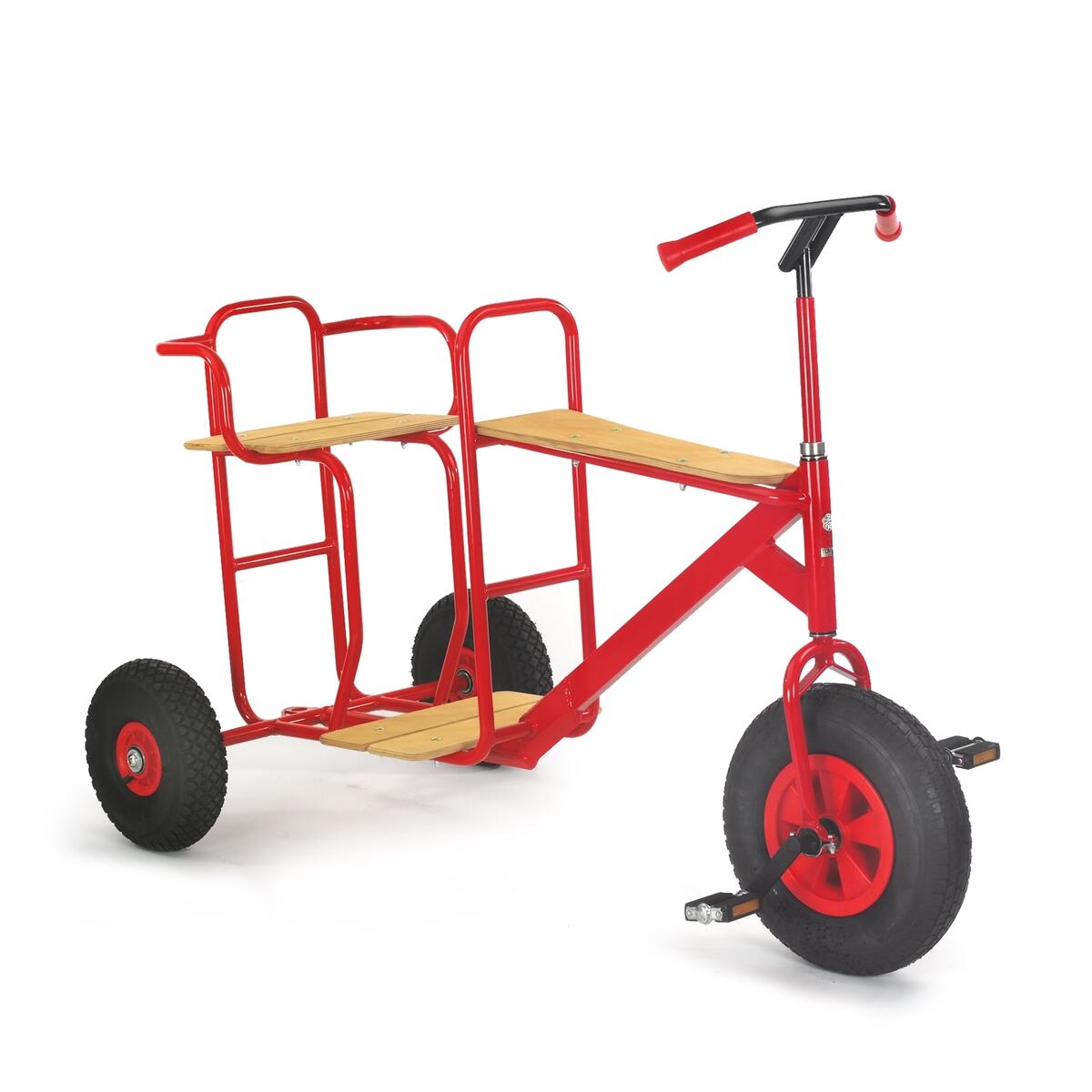 Hauska pyörä, joka sopii erinomaisesti roolileikkeihin. Kolmipyörä on varustettu raskailla renkailla, takaistuimella, vetokoukulla ja turvakahvalla, josta ylimääräinen matkustaja voi pitää kiinni. Mitat: 150 x 77 x 107 cm (LxSxK). Istuinkorkeus 69 cm. Toimitetaan valmiiksi koottuna. Valmistettu teräksestä sekä PP- ja PU-muovista. Istuin ja jalkalevy FSC-sertifioitua puuta. Ikäsuositus: yli 9-vuotiaille.