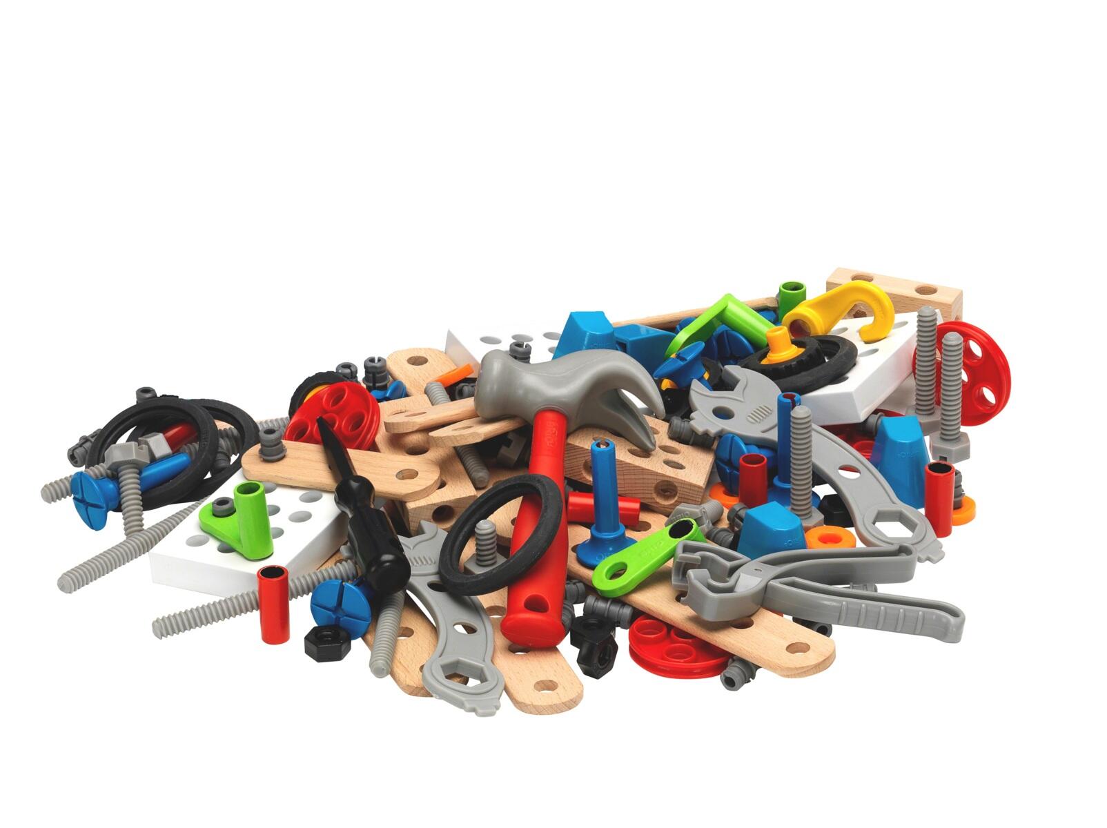 136 osaa. Suunnittele ja rakenna omia rakenteita. Hauska tapa kehittää silmän ja käden koordinaatiota sekä luovaa ajattelua. Mukana rakennusosia, ruuveja, muttereita, vasara ja ruuvimeisseli. Mitat: 31 x 20 x 9 cm. Valmistettu ABS- ja PP-muovista. Yli 3-vuotiaille.