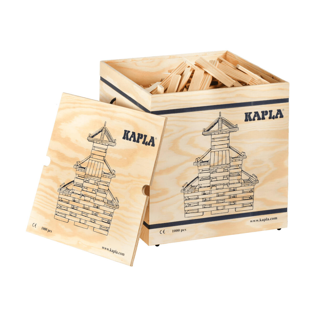 Puulaatikko pyörillä ja kannella, sisältää 1000 kpl Kapla-rakennuspalikkaa ja kaksi rakennusohjetta. Kaikki palikat ovat samanlaisia. Riittää monen tunnin luovaan rakenteluun. Palikat PEFC-merkittyä koivua, pituus 12 cm. Yli 3-vuotiaille.