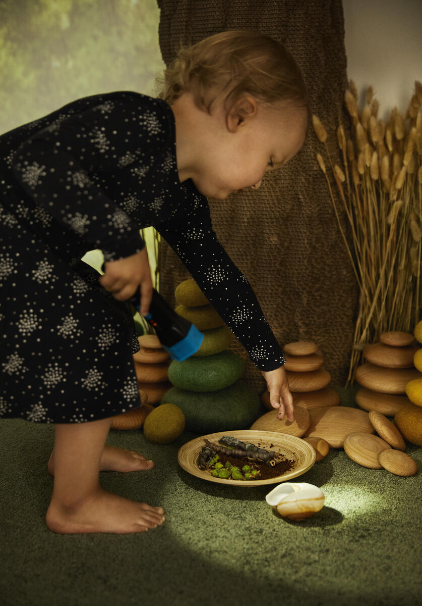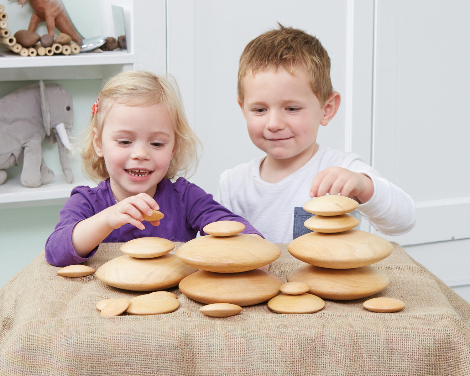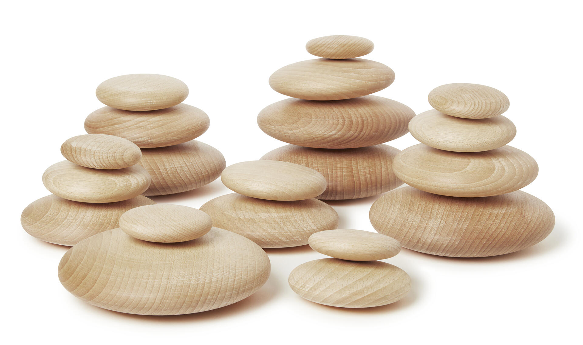 Sileät, puiset kivet sopivat moneen leikkiin. Kiviä voi pinota päällekkäin, asettaa ne suuruusjärjestykseen tai vierittää niitä. Kiviä on neljää eri kokoa, halkasija 4,5 - 15 cm. Puuta. Yli 10 kk.