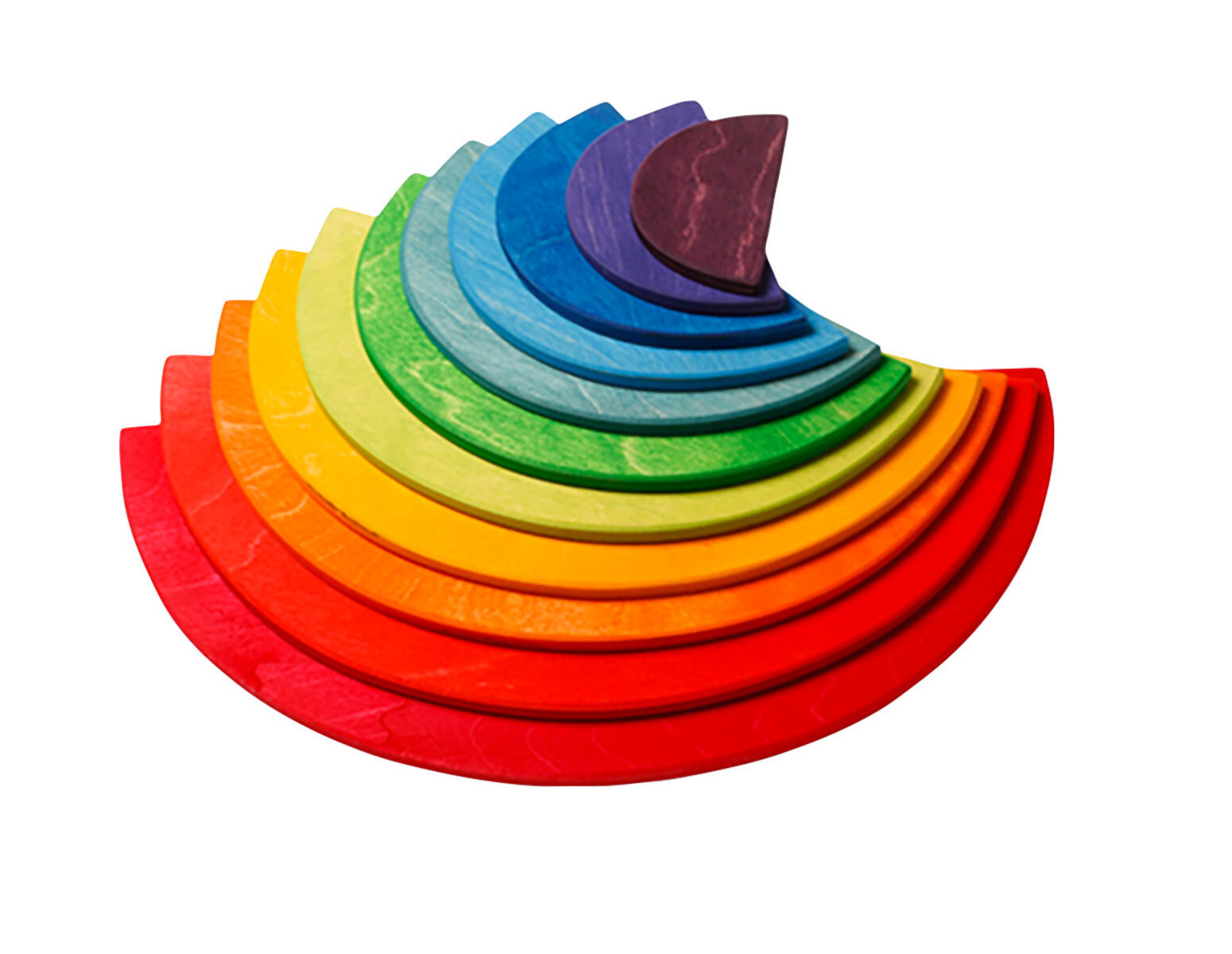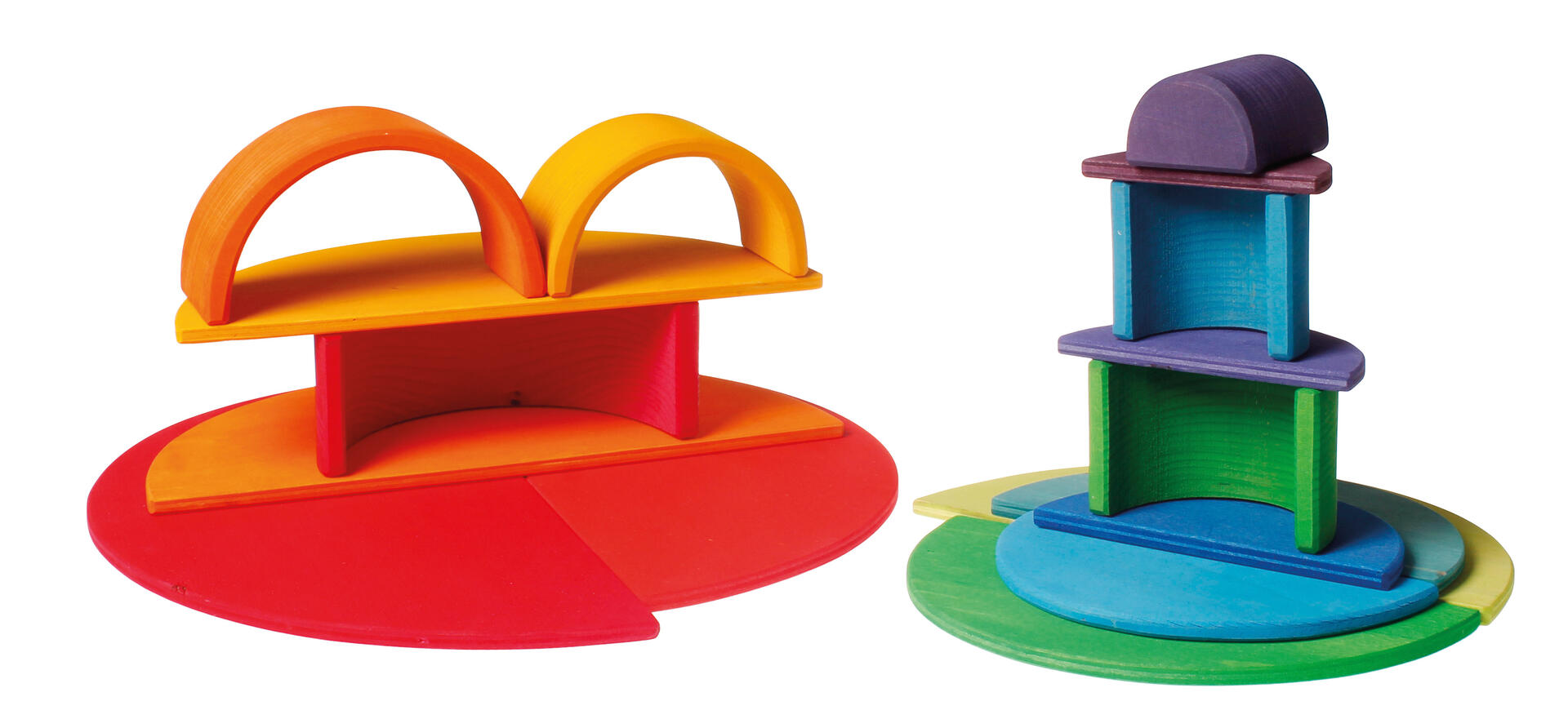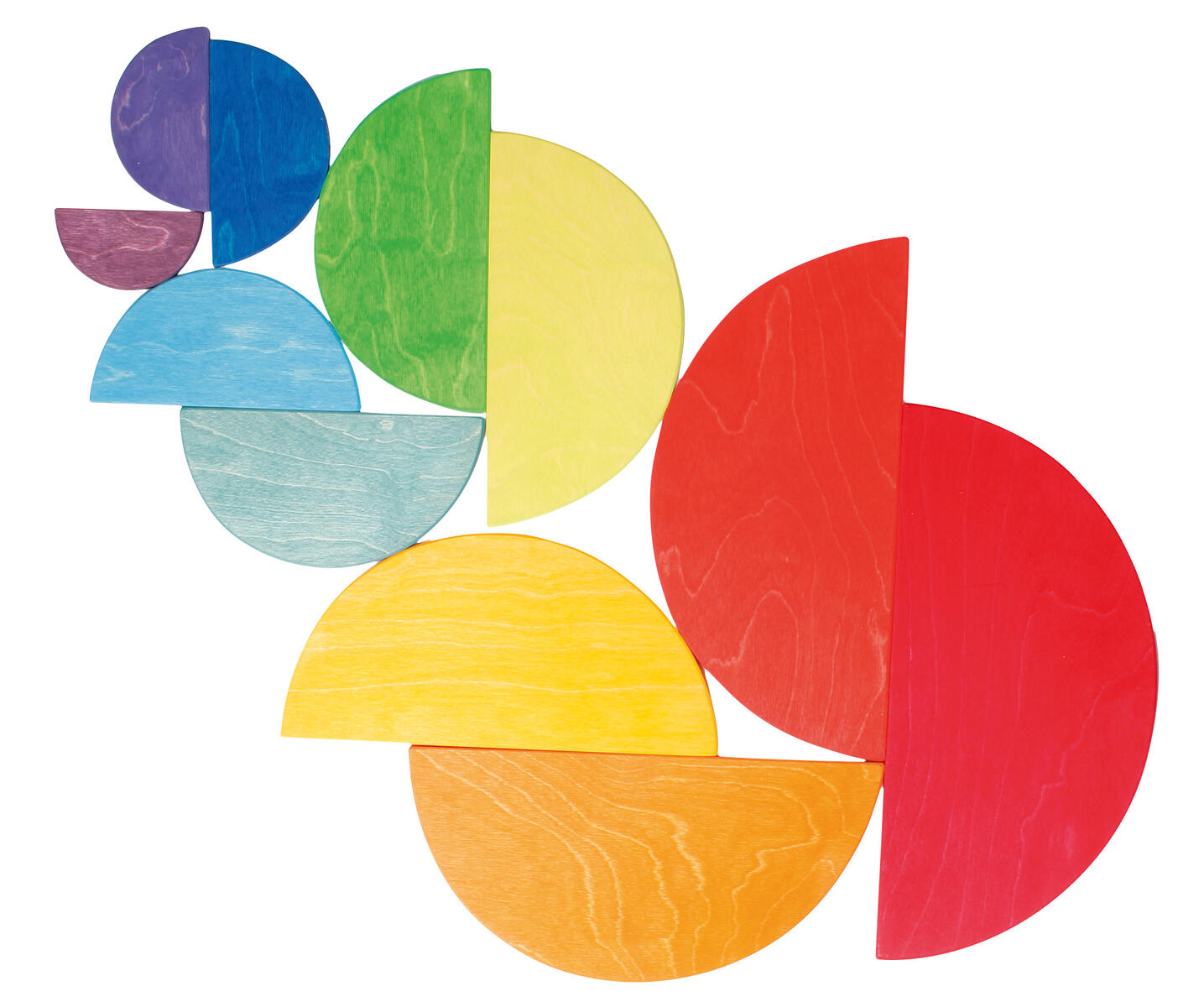 Sarjassa on 11 kauniin väristä puoliympyrää. Paloja voi käyttää monin eri tavoin, niistä voi rakentaa ainutlaatuisia rakennelmia. Ne voi yhdistää esim. Grimms sateenkaaripalojen kanssa. FSC-merkittyä puuta. Petsattu myrkyttömillä, vesipohjaisilla väreillä. Yli 1-vuotiaille.