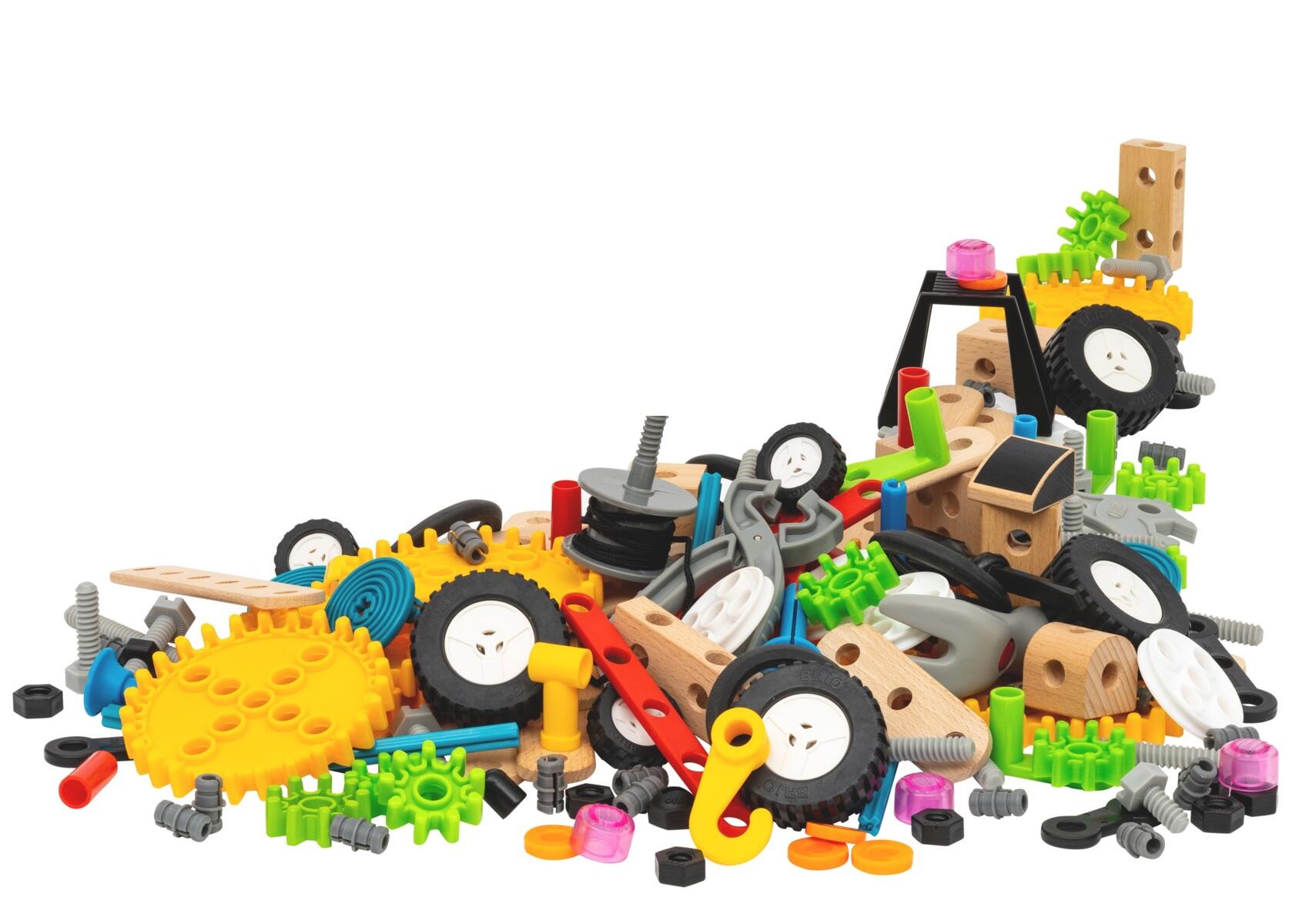 210 osaa. Sisältää muun muassa ruuvimeisselin, vasaran, jakoavaimen, hammasrattaita ja -pyöriä, muttereita ja pultteja. Avoin rakennusleikki stimuloi lapsen mielikuvitusta ja kokeiluhalua sekä harjoittaa käsi-silmä-koordinaatiota. Mitat: 31 x 30 x 7 cm. Valmistettu ABS- ja PP-muovista sekä puusta. Yli 3-vuotiaille.