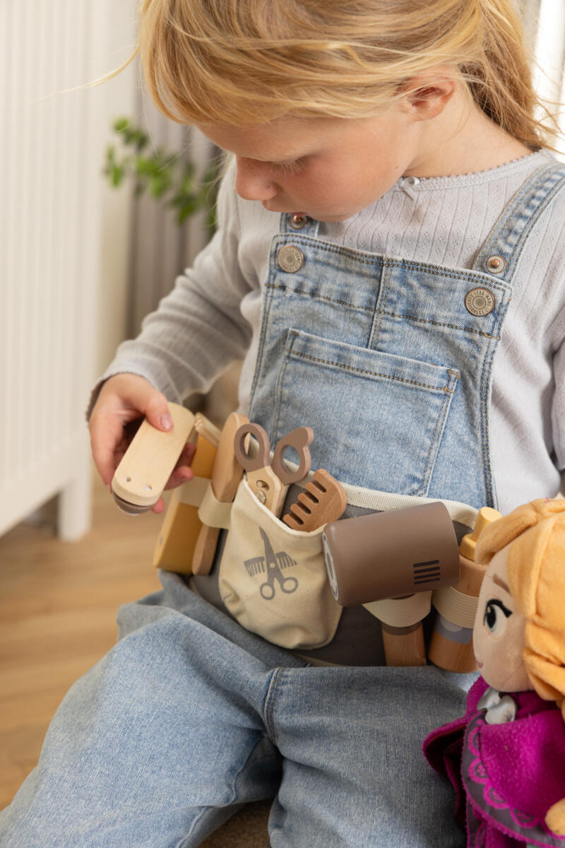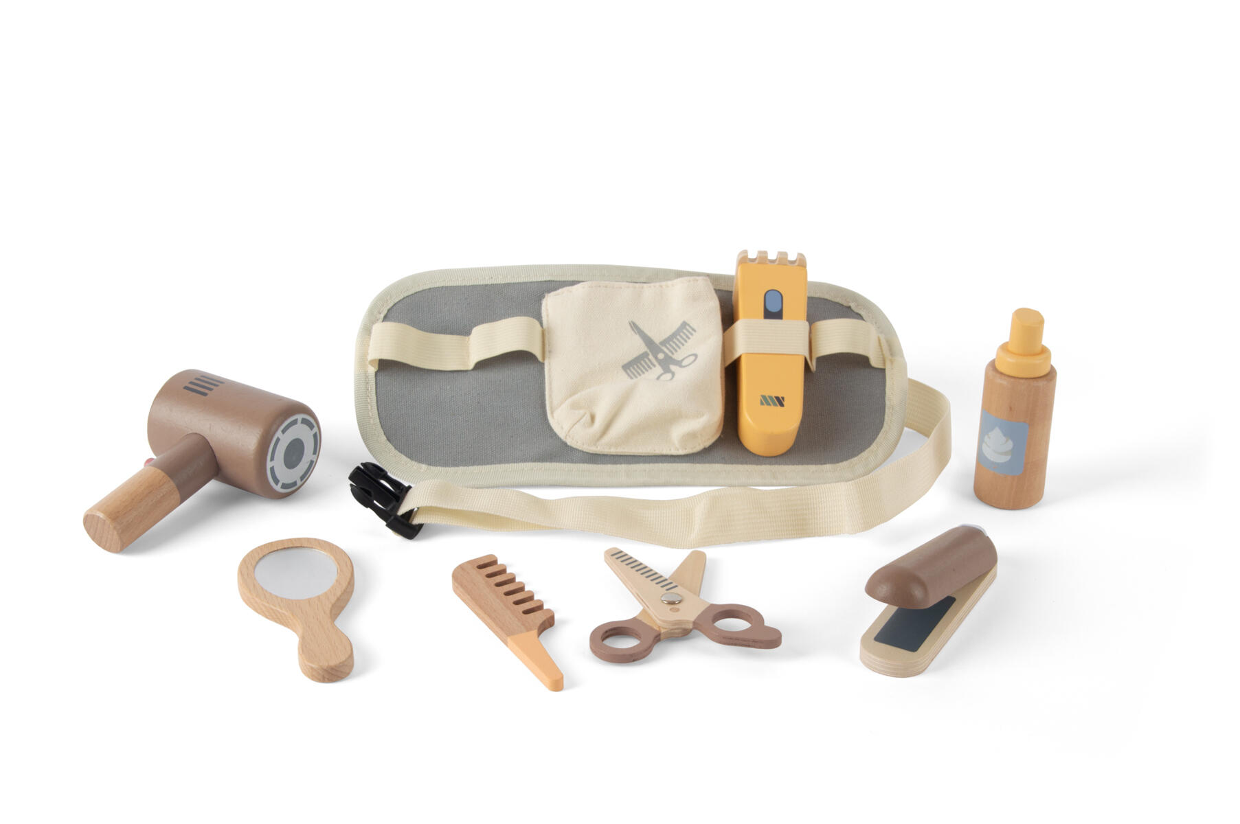 Hauska parturi- ja kampaajasetti, jolla voit leikata, ajaa ja muotoilla partasi kuin ammattilainen. Setti sisältää kaiken tarvitsemasi: puiset sakset taianomaisiin muodonmuutoksiin, hiustenkuivaajan villeihin hiuspäiviin ja trimmerin täydelliseen partaan. Pakattu pyörillä varustettuun laukkuun. Valmistettu FSC-sertifioidusta puusta, polyesteristä ja polypropeenista. Yli 3-vuotiaille.