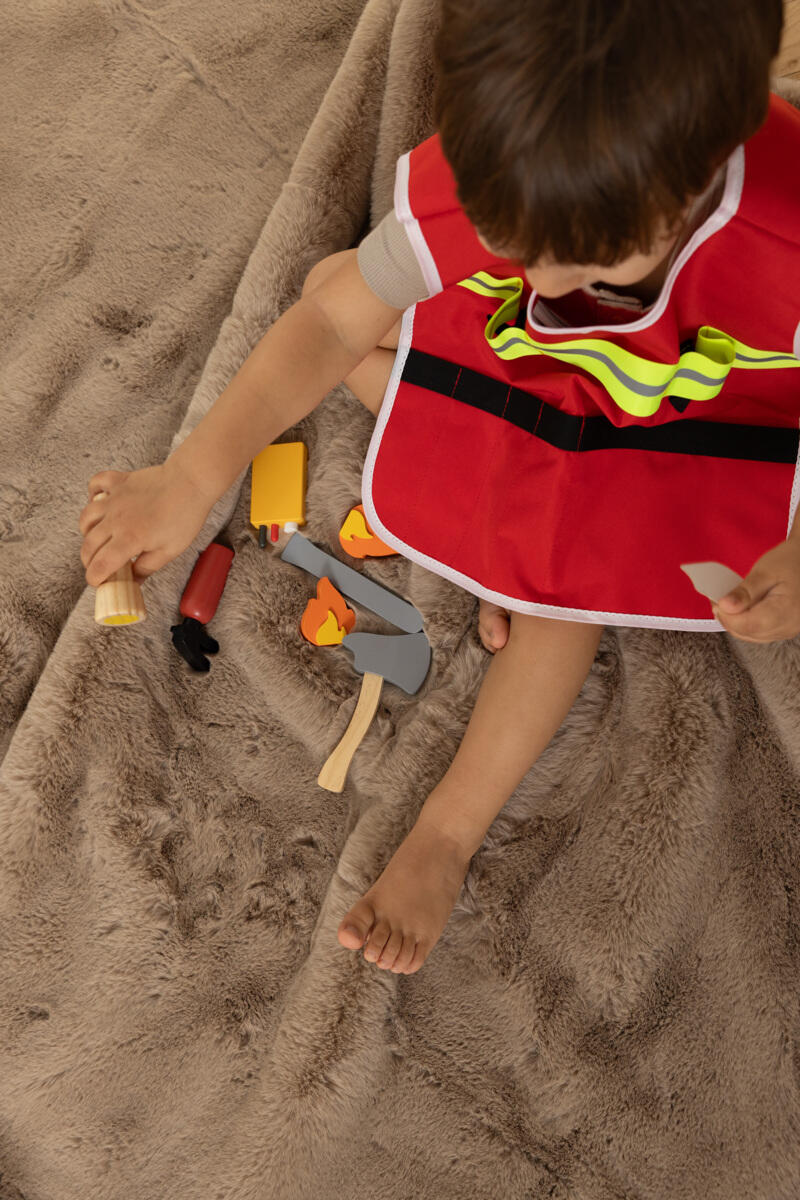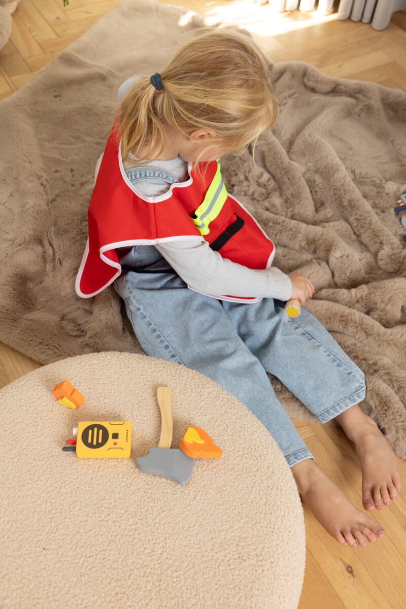 6 osaa. Sisältää sammuttimen, radiopuhelimen, taskulampun, paloliivin, sorkkaraudan ja kirveen. Täydellinen mielikuvitusleikkeihin ja roolileikkeihin, joissa lapset voivat kehittää empatiaa, tiimityöskentelyä ja toimintataitoja. Valmistettu polyesteristä, puuvillasta, FSC-sertifioidusta puusta ja MDF-levystä. Yli 3-vuotiaille.