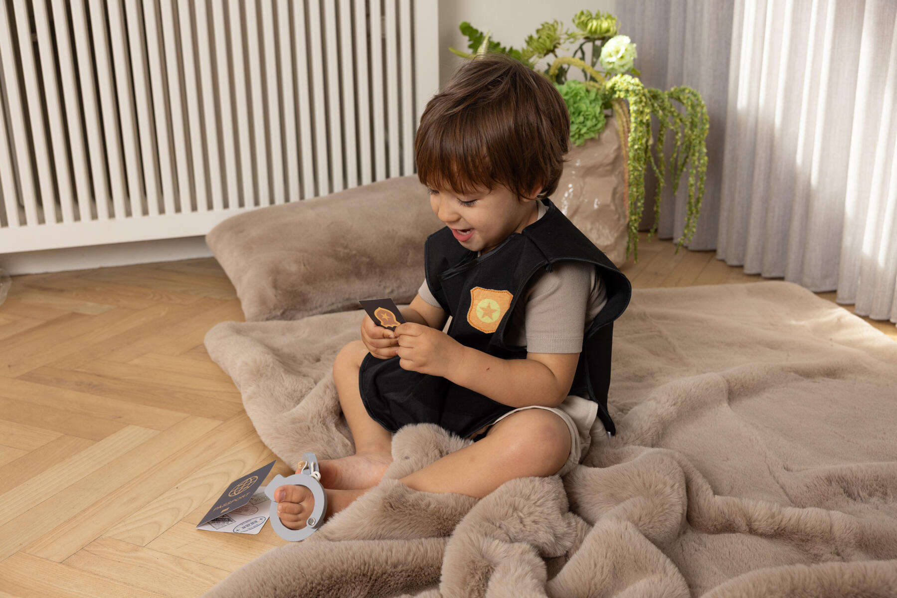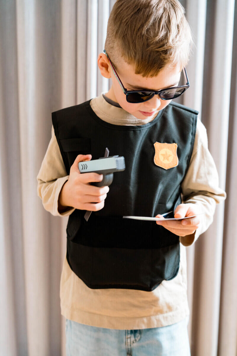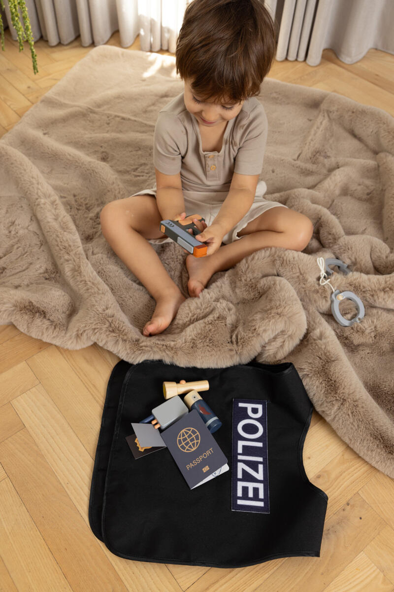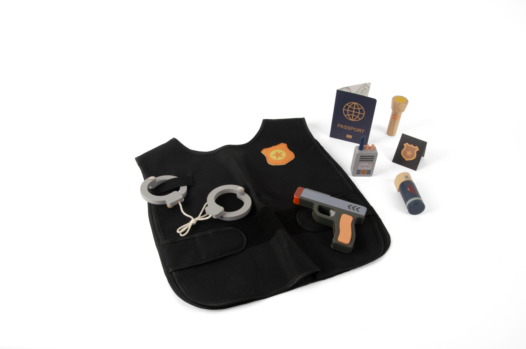 5 osaa. Sisältää käsiraudat, leikkiaseen, taskulampun, poliisiliivin ja poliisimerkin. Täydellinen pikkupoliiseille, jotka rakastavat olla arjen sankareita. Valmistettu FSC-sertifioidusta puusta, puuvillasta ja MDF-levystä. Yli 3-vuotiaille.