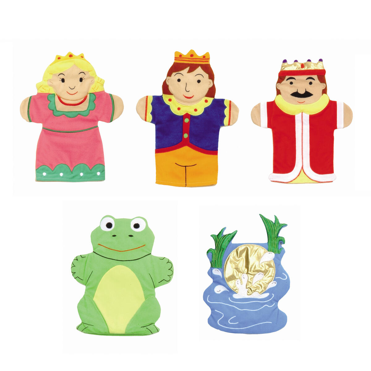 Hahmot tunnetusta Sammakkoprinssi sadusta. Käsinuket saavat tarinan elämään. Polyesteria. Hienopesu 30°C. Käsinuken pituus 28 cm. Yli 3-vuotiaille.