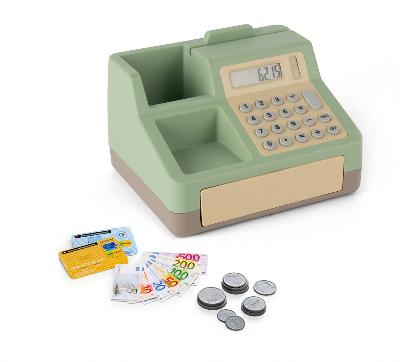 Kassakone, joka innostaa lapsia roolileikkiin ja kehittää ymmärrystä numeroista, rahasta ja sosiaalisista vuorovaikutustilanteista. Varustettu aurinkokennolla toimivalla laskimella – ei paristojen vaihtotarvetta. Leikkirahat sisältyvät pakkaukseen. HDPE- ja ABS-muovia. Yli 3-vuotiaille.