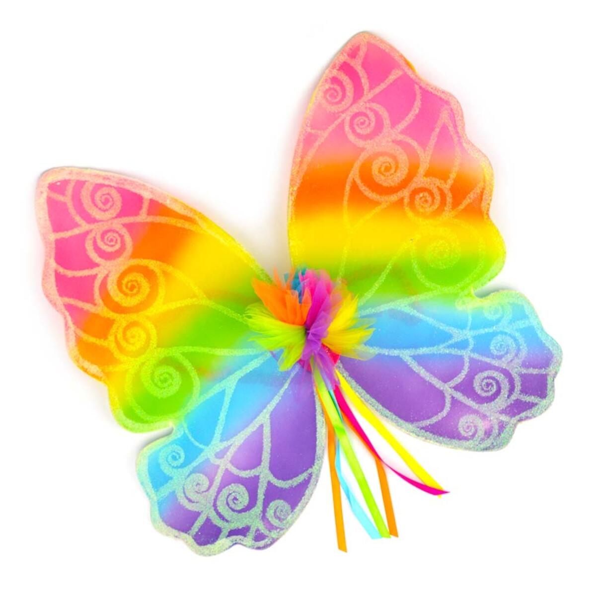Siivet on helppo pukea ja mukavat käyttää joustavien satiinipäällysteisten olkahihnojen ansiosta. Sateenkaaren värit, koristeltu kauniilla hopeaglitterillä. Takana myös tylliä silkkinauhoilla. Valmistettu polyesteristä ja metallista. Yli 3-vuotiaille.