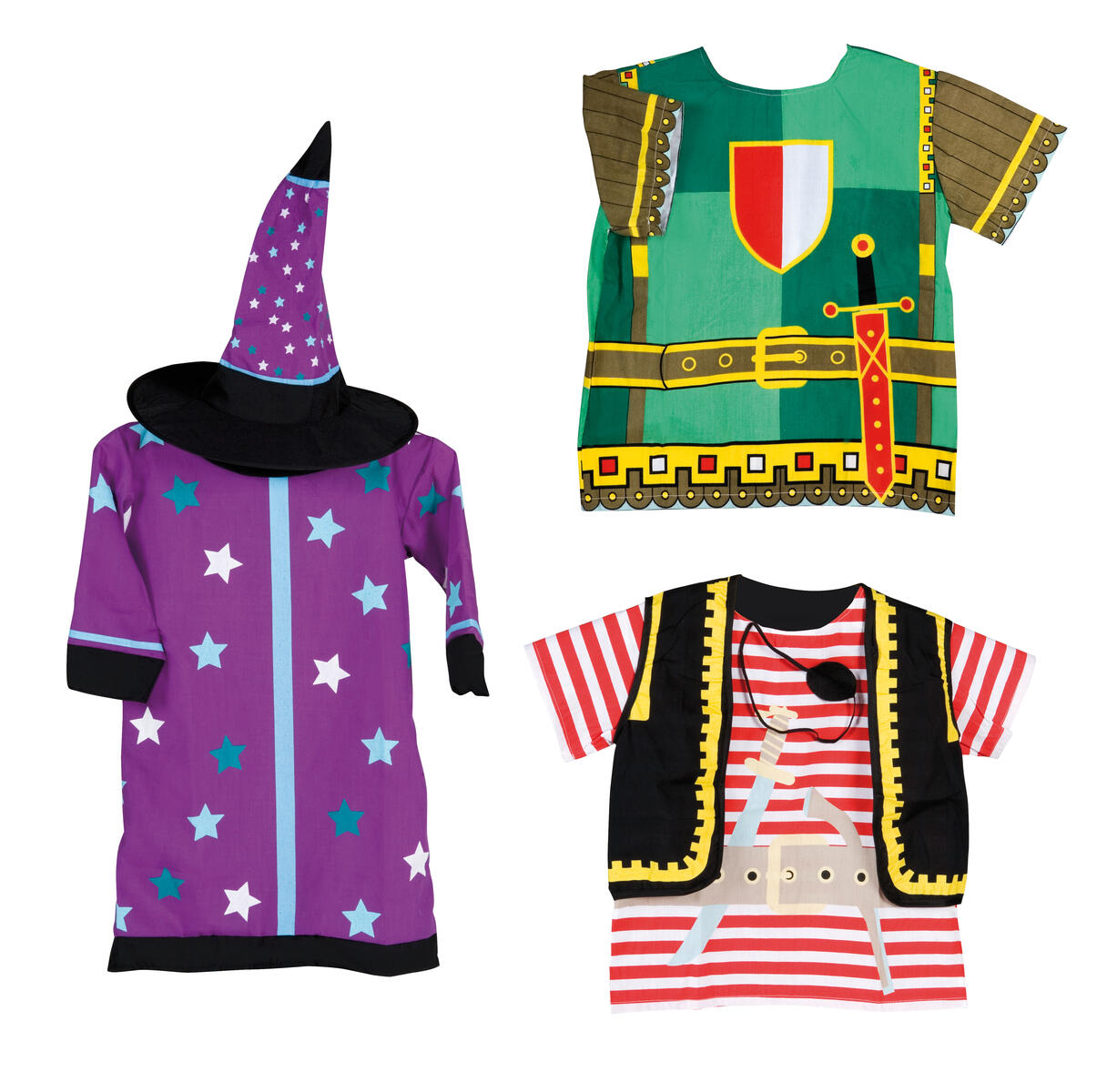 Yksinkertaiset rooliasut, jotka on helppo pukea ja riisua, kiinnitys tarranauhalla selästä. Sopii 2,5-6 vuotiaille lapsille, pituus 68 cm. Pestävä 30 asteessa. Materiaali: polyesteri ja puuvilla.