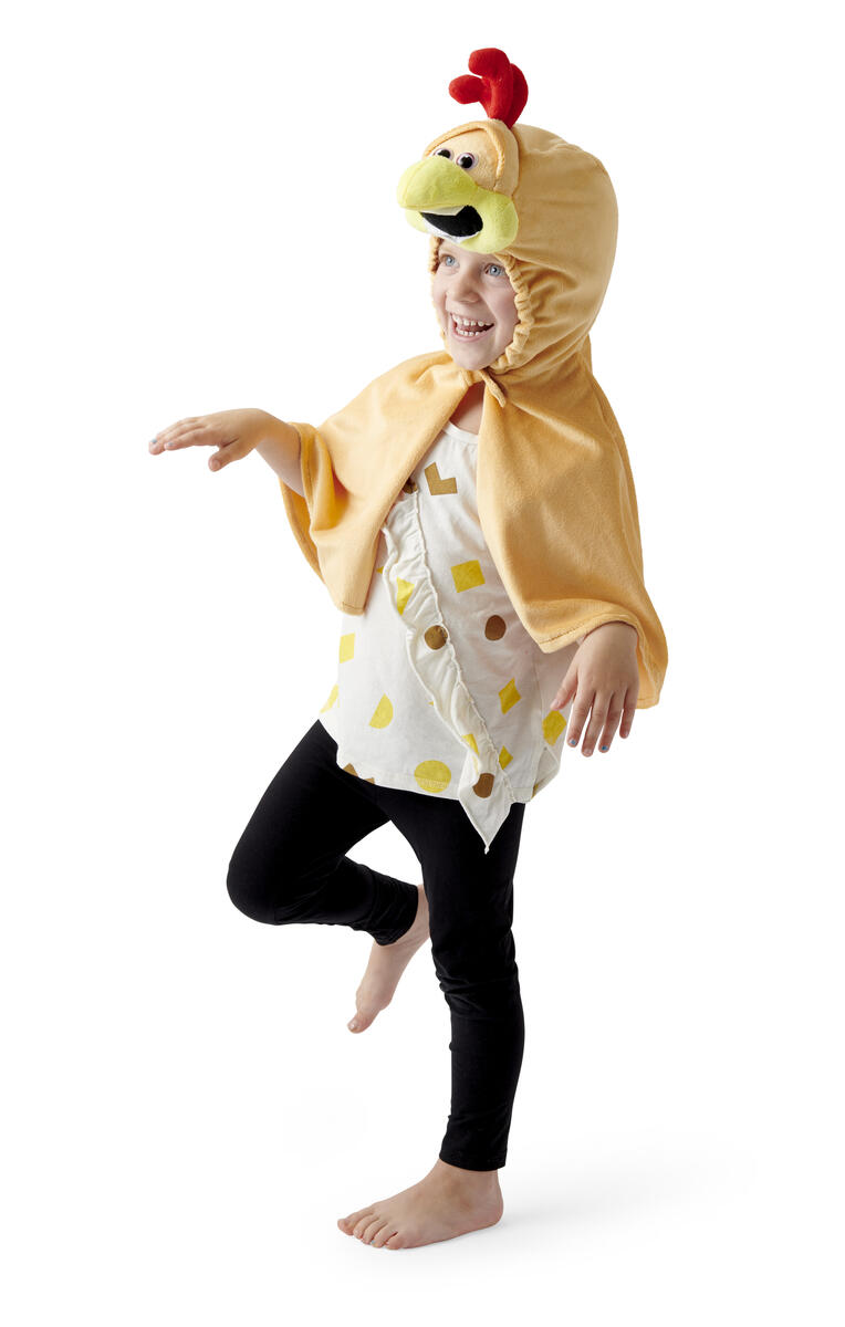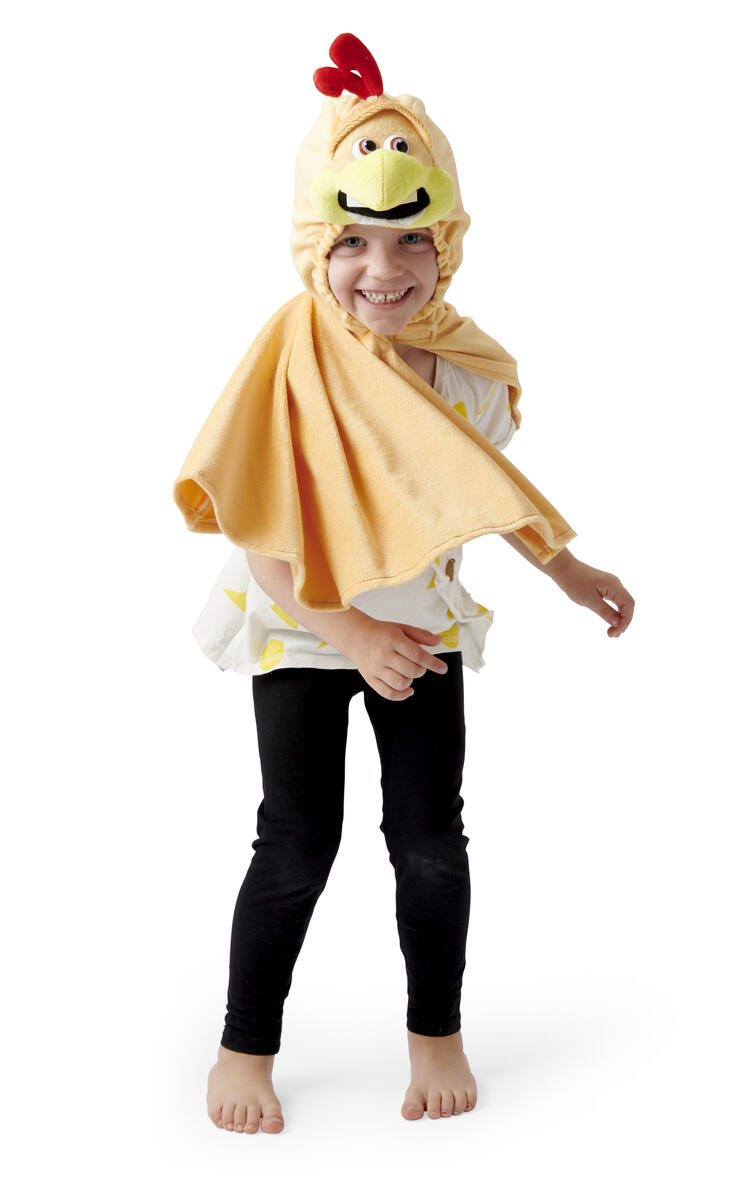 Rooliviitta, jossa huppu on kanan pää. Kiva rooliasu, tarrakiinnitteinen viitta on helppo pukea ja riisua. Materiaali on pehmeää polyesteriplyysia. Käsipesu. 3 - 6 -vuotiaille.